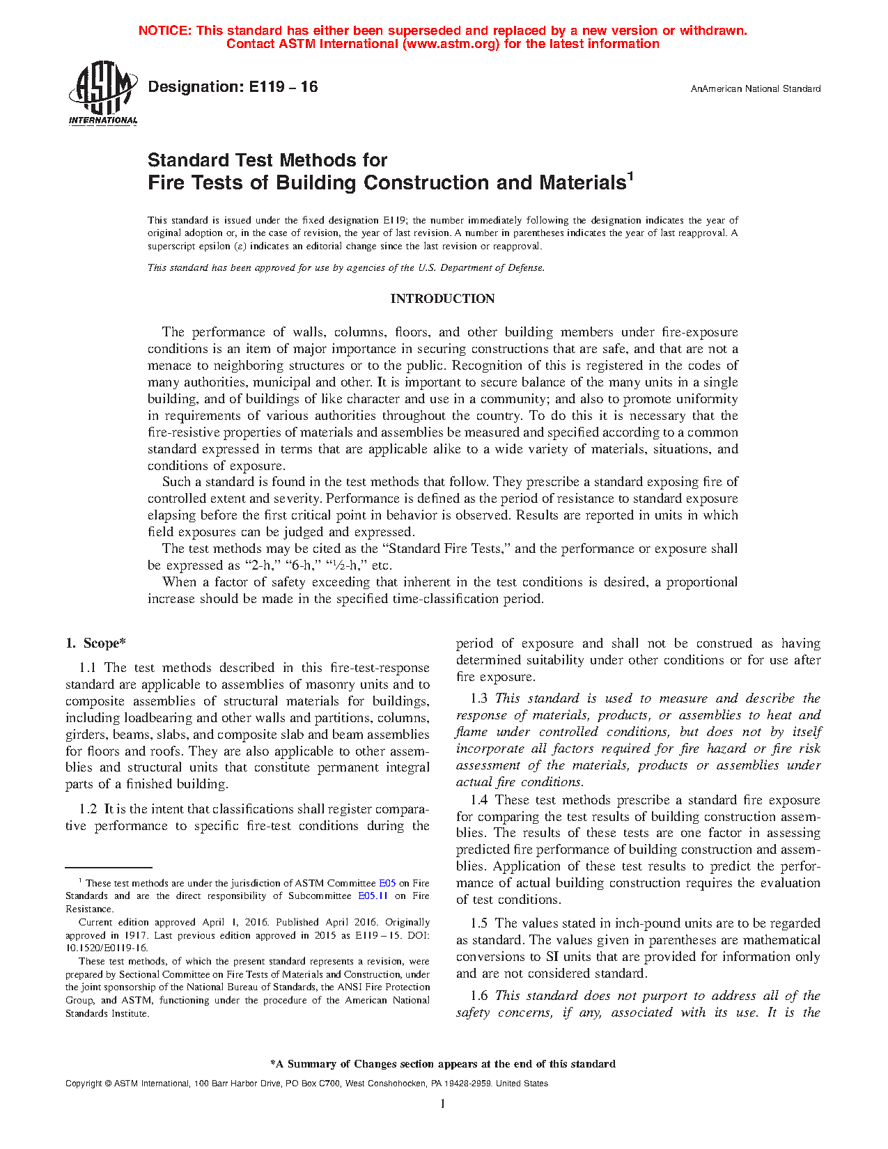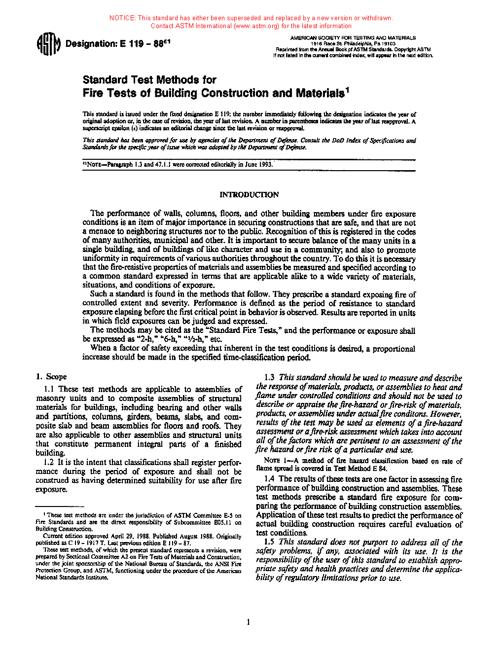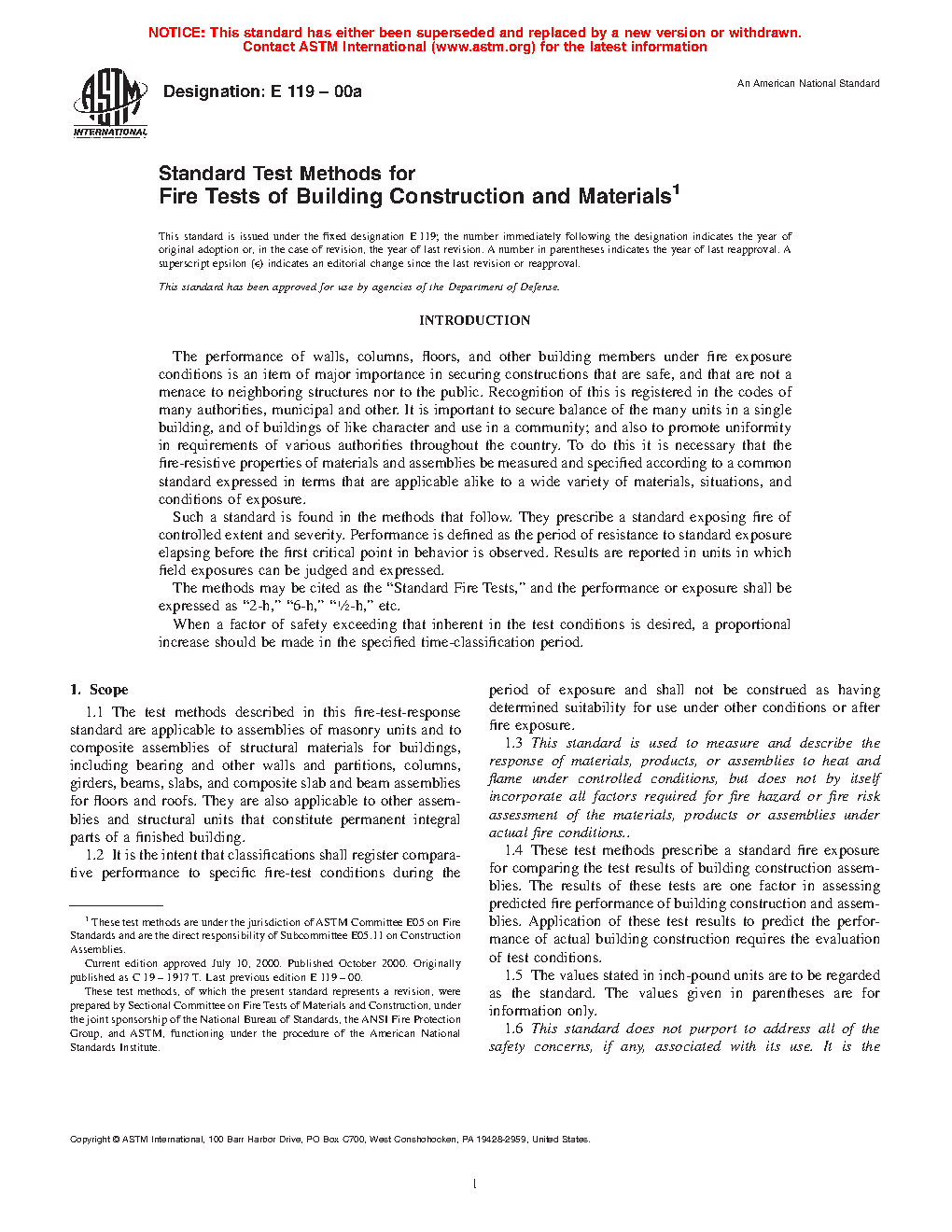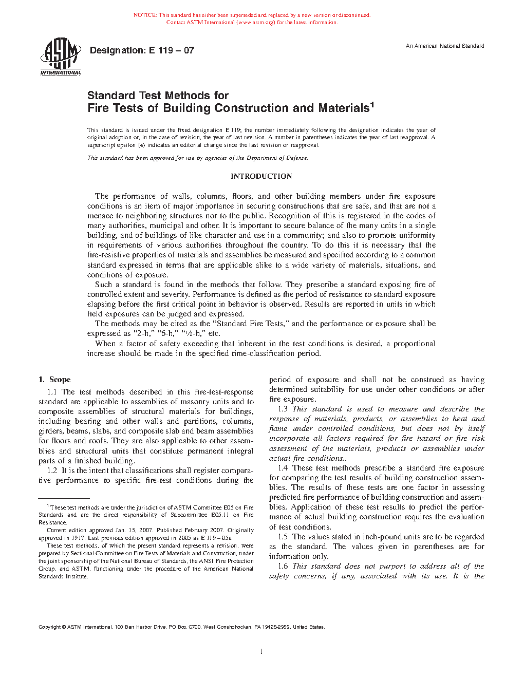 1.1 The test methods described in this fire-test-response standard are applicable to assemblies of masonry units and to composite assemblies of structural materials for buildings, including loadbearing and other walls and partitions, columns, girders, beams, slabs, and composite slab and beam assemblies for floors and roofs. They are also applicable to other assemblies and structural units that constitute permanent integral parts of a finished building.