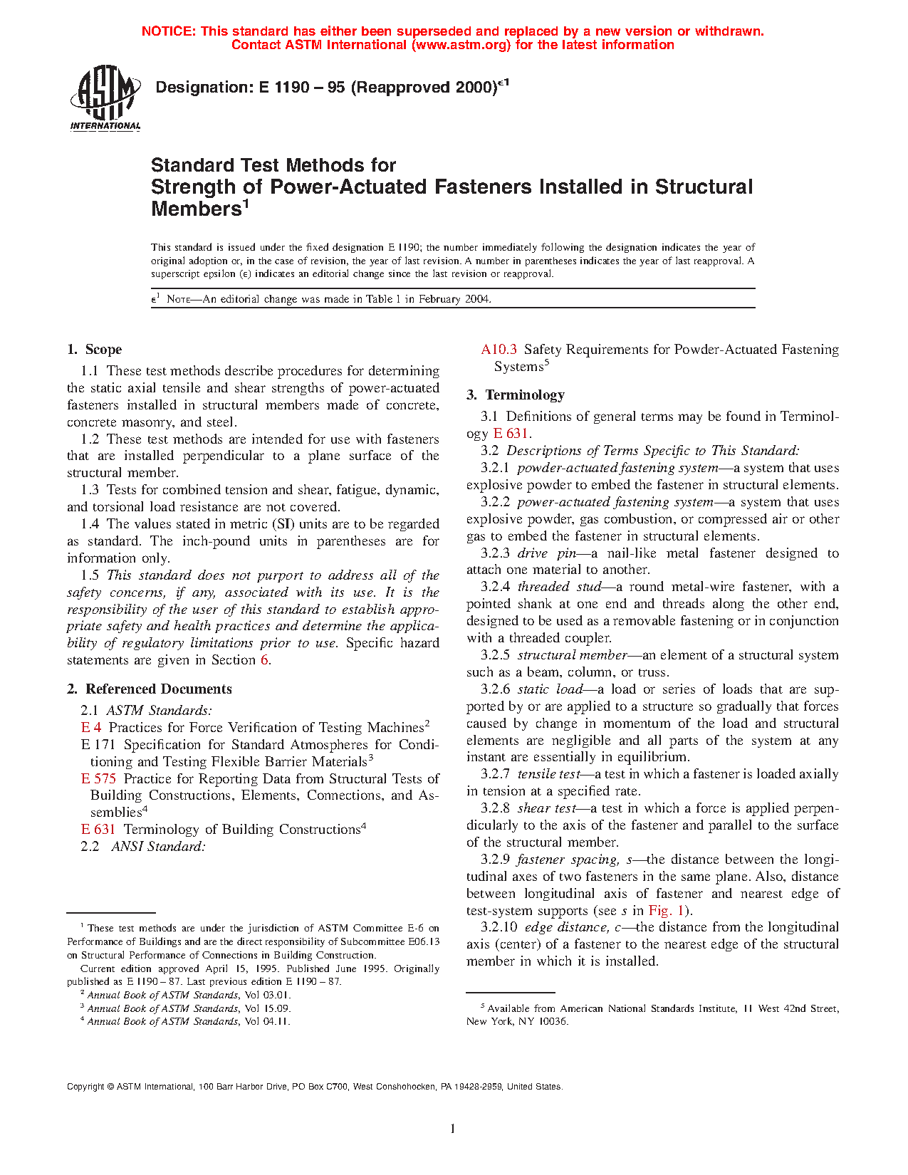 1.1 These test methods describe procedures for determining the static axial tensile and shear strengths of power-actuated fasteners installed in structural members made of concrete, concrete masonry, and steel.