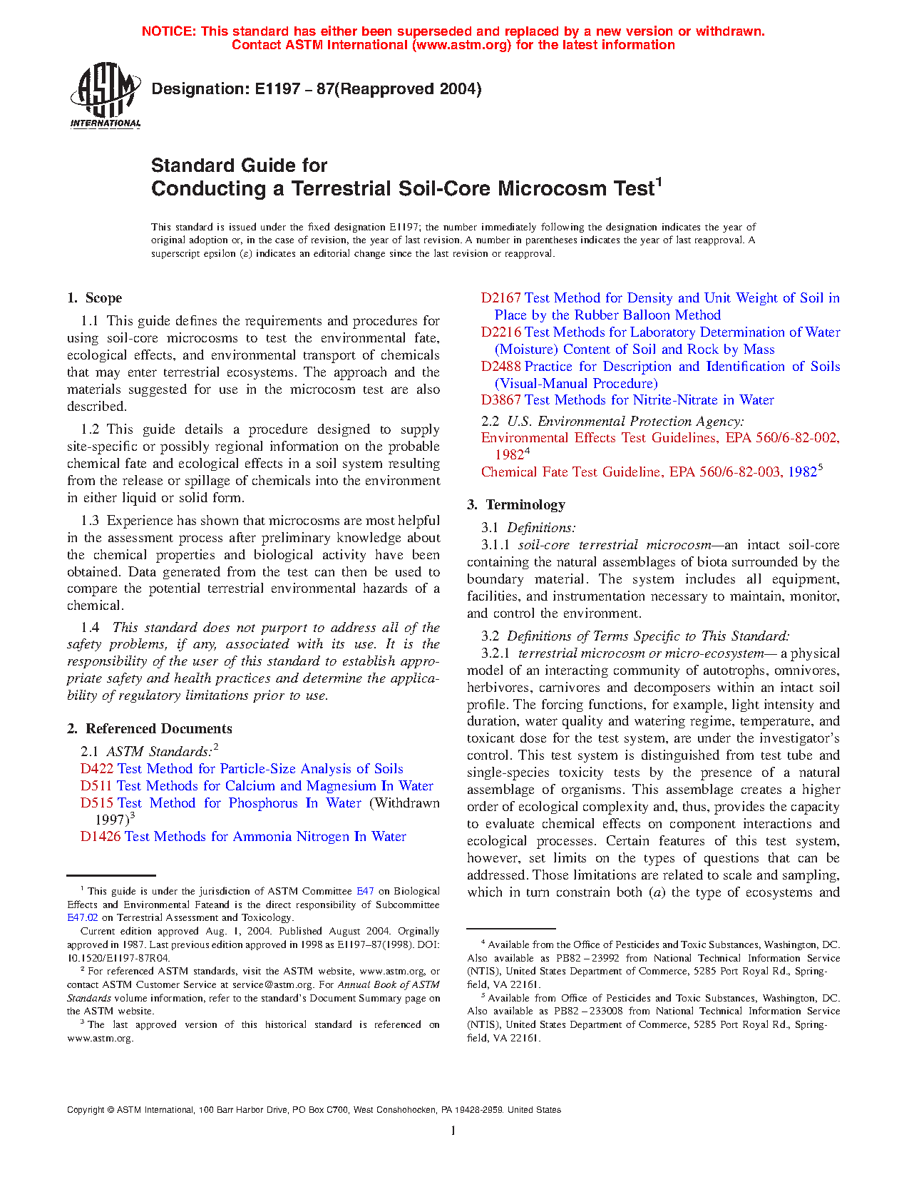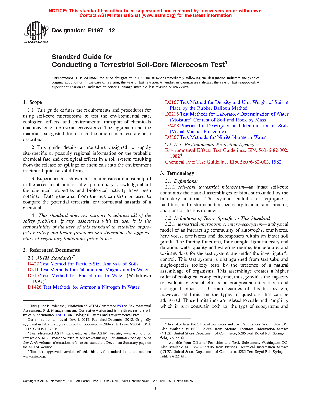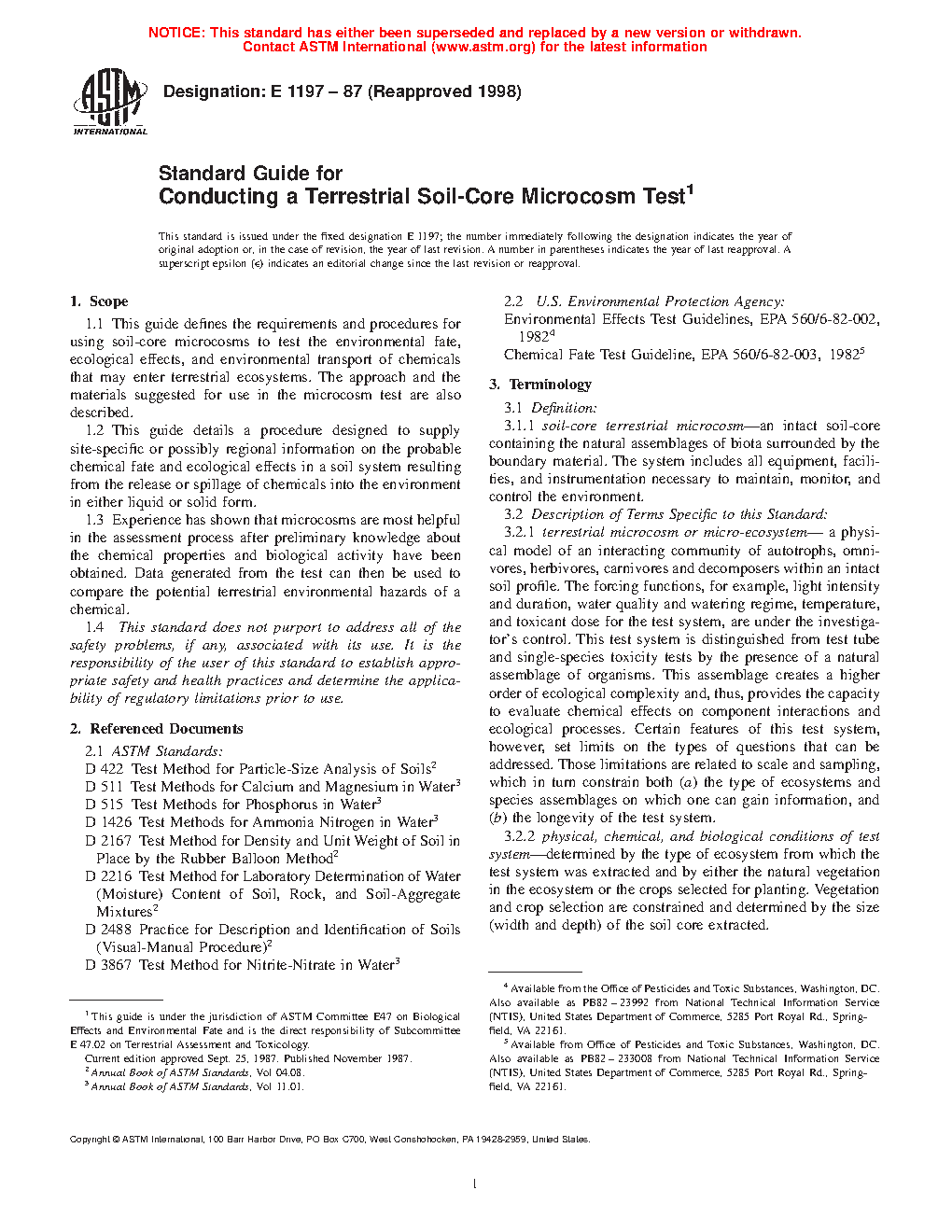1.1 This guide defines the requirements and procedures for using soil-core microcosms to test the environmental fate, ecological effects, and environmental transport of chemicals that may enter terrestrial ecosystems. The approach and the materials suggested for use in the microcosm test are also described.