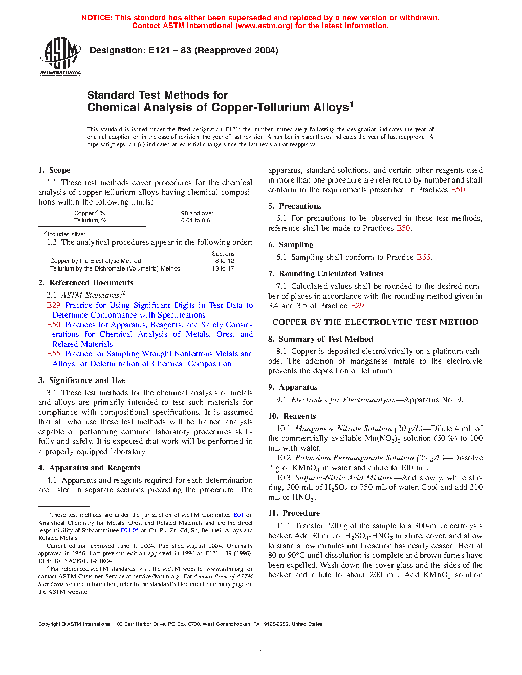These test methods for the chemical analysis of metals and alloys are primarily intended to test such materials for compliance with compositional specifications. It is assumed that all who use these test methods will be trained analysts capable of performing common laboratory procedures skillfully and safely. It is expected that work will be performed in a properly equipped laboratory.