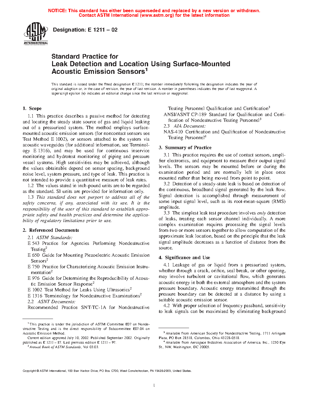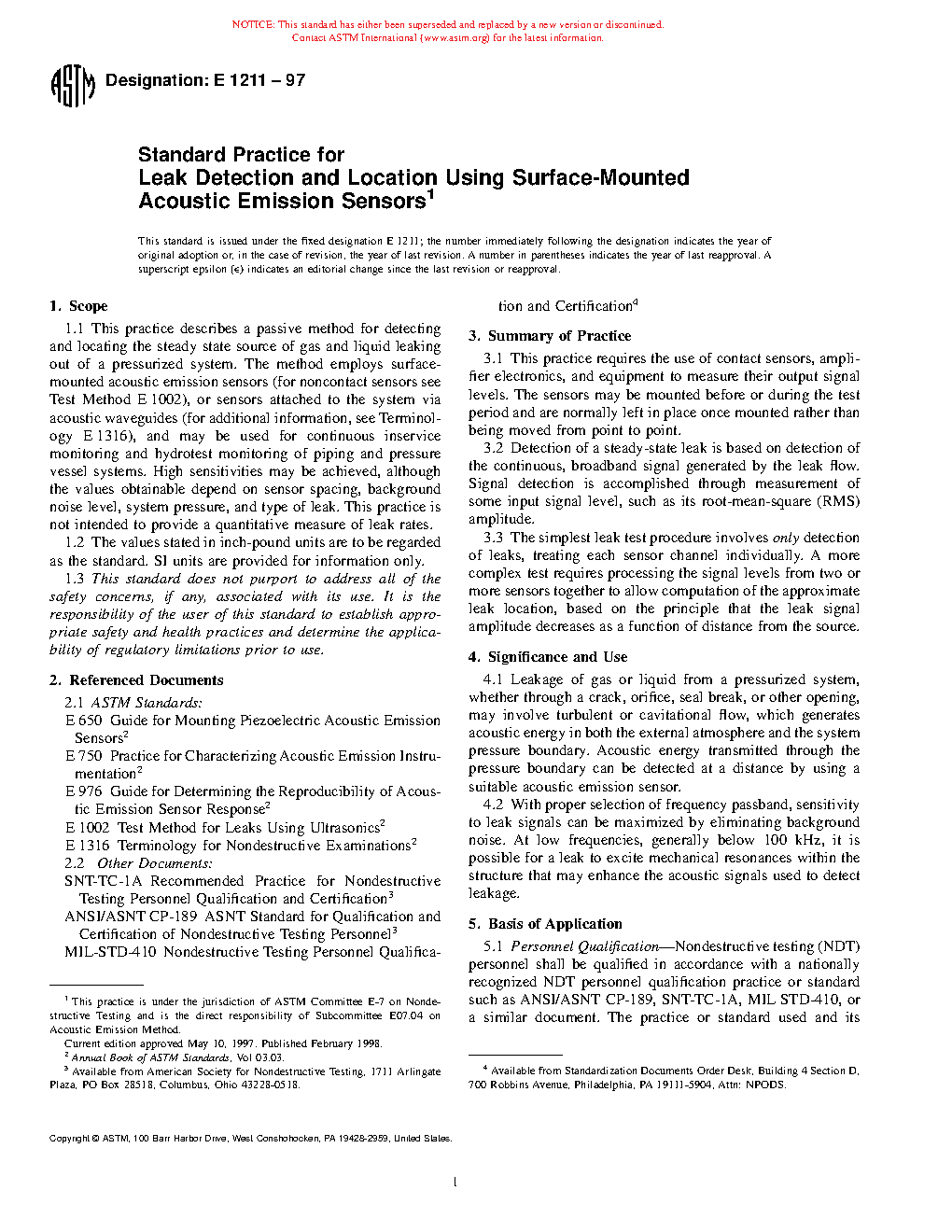 1.1 This practice describes a passive method for detecting and locating the steady state source of gas and liquid leaking out of a pressurized system. The method employs surface-mounted acoustic emission sensors (for non-contact sensors see Test Method E 1002), or sensors attached to the system via acoustic waveguides (for additional information, see Terminology E 1316), and may be used for continuous in-service monitoring and hydrotest monitoring of piping and pressure vessel systems. High sensitivities may be achieved, although the values obtainable depend on sensor spacing, background noise level, system pressure, and type of leak.