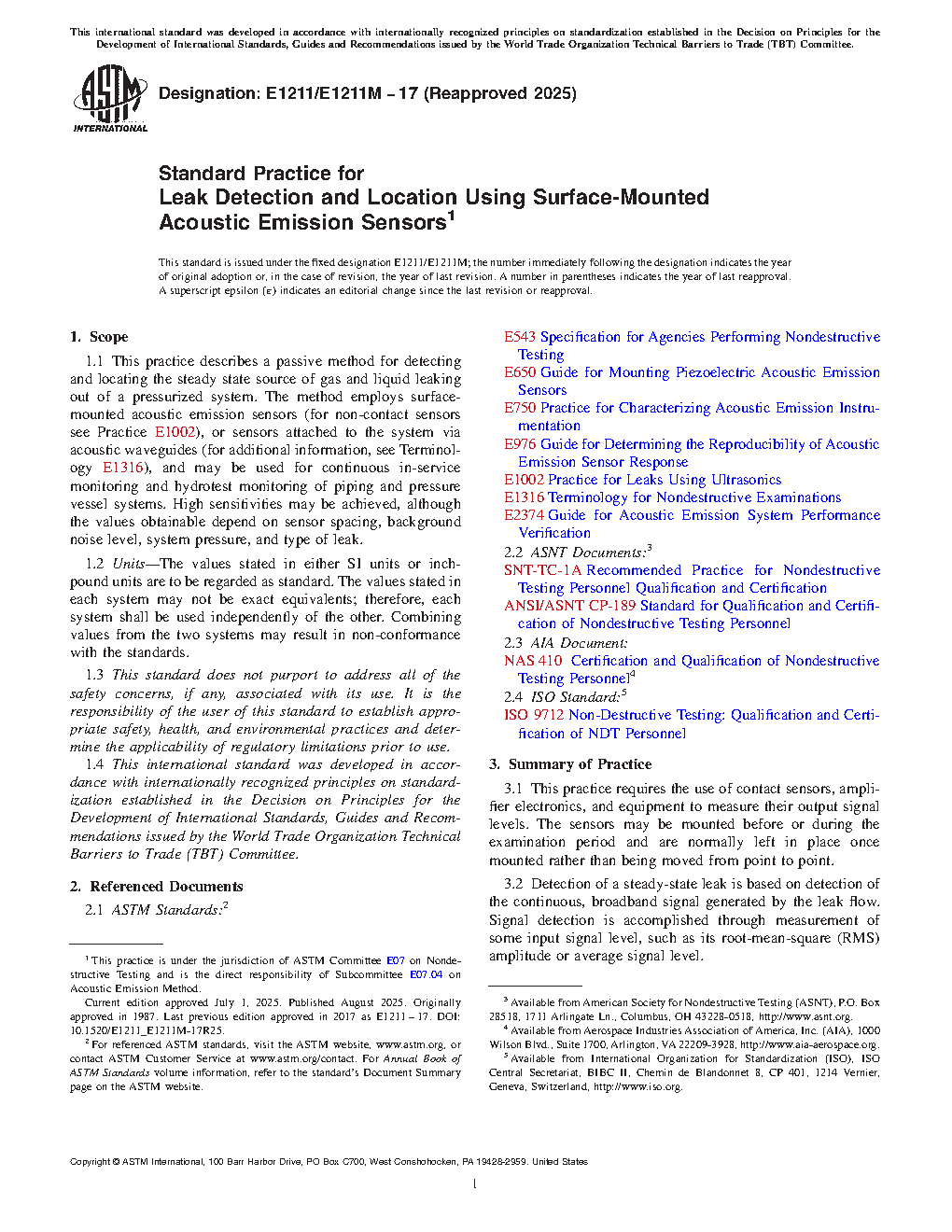 1.1 This practice describes a passive method for detecting and locating the steady state source of gas and liquid leaking out of a pressurized system. The method employs surface-mounted acoustic emission sensors (for non-contact sensors see Test Method E1002), or sensors attached to the system via acoustic waveguides (for additional information, see Terminology E1316), and may be used for continuous in-service monitoring and hydrotest monitoring of piping and pressure vessel systems. High sensitivities may be achieved, although the values obtainable depend on sensor spacing, background noise level, system pressure, and type of leak.