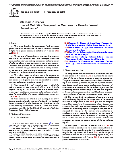 1.1 This guide describes the application of melt wire temperature monitors and their use for reactor vessel surveillance of light-water power reactors as called for in Practices E185 and E2215.
