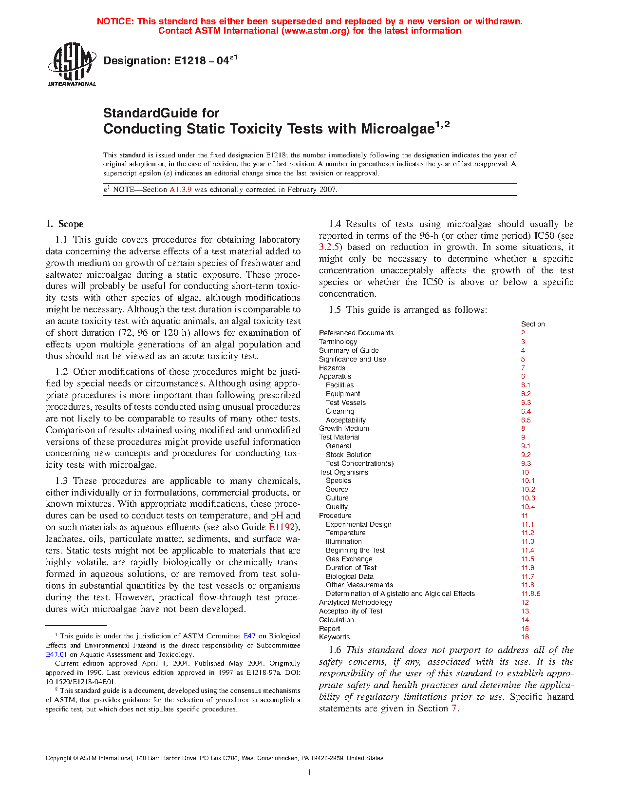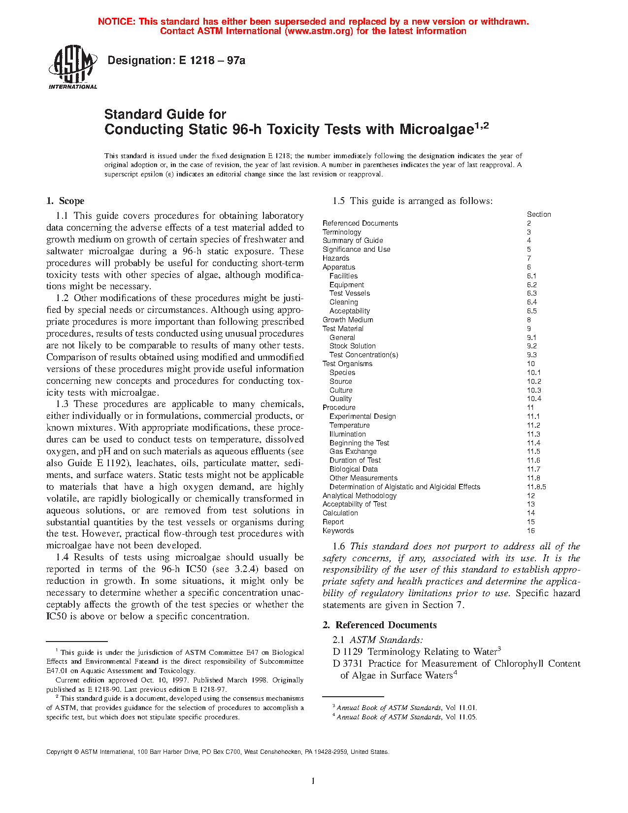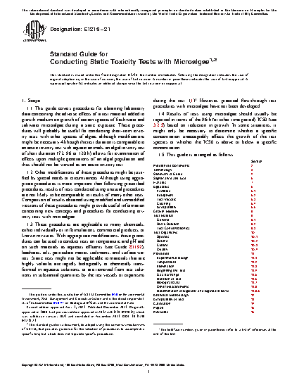 1.1 This guide covers procedures for obtaining laboratory data concerning the adverse effects of a test material added to growth medium on growth of certain species of freshwater and saltwater microalgae during a static exposure. These procedures will probably be useful for conducting short-term toxicity tests with other species of algae, although modifications might be necessary. Although the test duration is comparable to an acute toxicity test with aquatic animals, an algal toxicity test of short duration (72, 96 or 120 h) allows for examination of effects upon multiple generations of an algal population and thus should not be viewed as an acute toxicity test.
