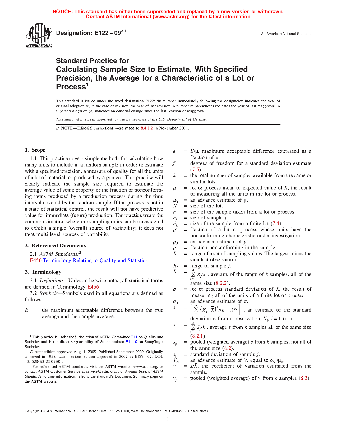 This practice is intended for use in determining the sample size required to estimate, with specified precision, a measure of quality of a lot or process. The practice applies when quality is expressed as either the lot average for a given property, or as the lot fraction not conforming to prescribed standards. The level of a characteristic may often be taken as an indication of the quality of a material. If so, an estimate of the average value of that characteristic or of the fraction of the observed values that do not conform to a specification for that characteristic becomes a measure of quality with respect to that characteristic. This practice is intended for use in determining the sample size required to estimate, with specified precision, such a measure of the quality of a lot or process either as an average value or as a fraction not conforming to a specified value.