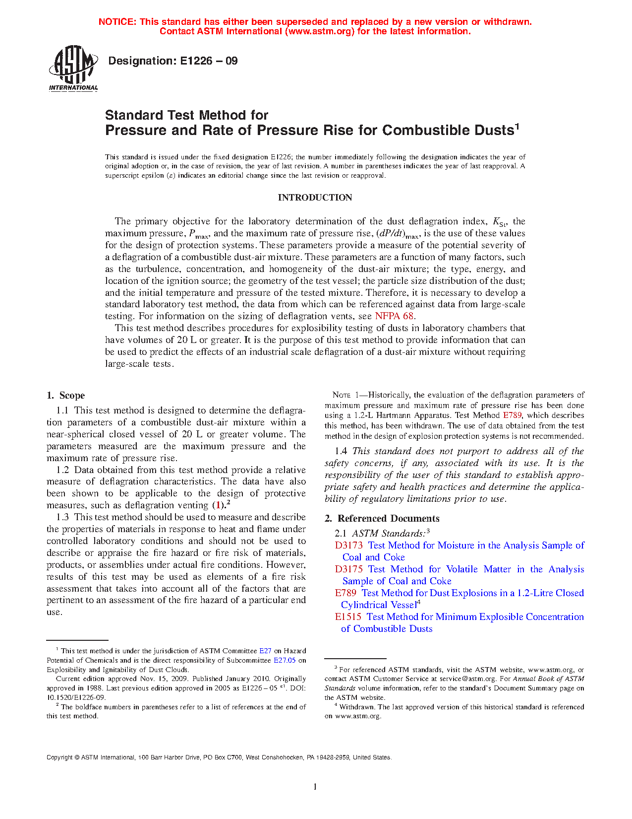 Note 1-The evaluation of the deflagration parameters of maximum pressure and maximum rate of pressure rise can also be done using a 1.2-L Hartmann Apparatus. Test Method E789, has been published regarding this application; however, the use of these data in the design of deflagration venting and containment systems is not recommended.1.4 This standard does not purport to address all of the safety concerns, if any, associated with its use. It is the responsibility of the user of this standard to establish appropriate safety and health practices and determine the applicability of regulatory limitations prior to use.