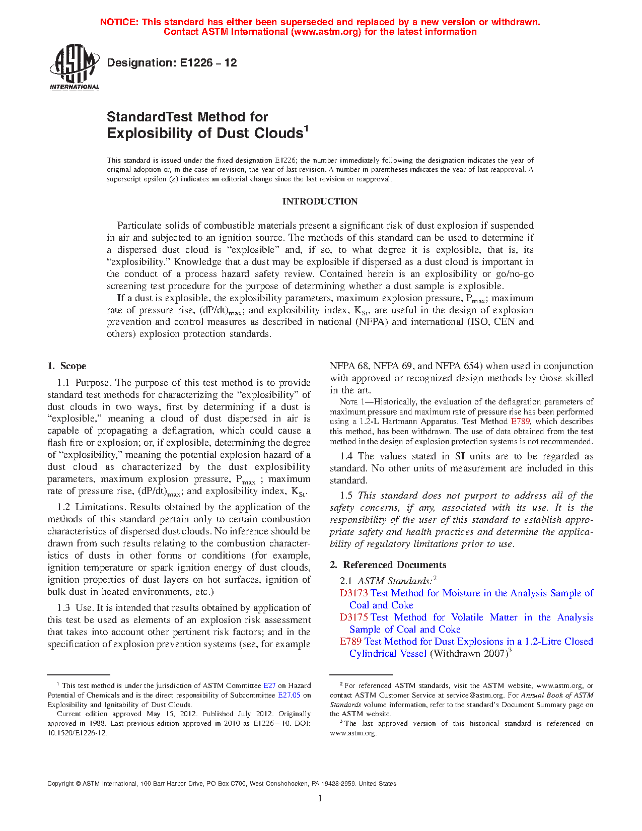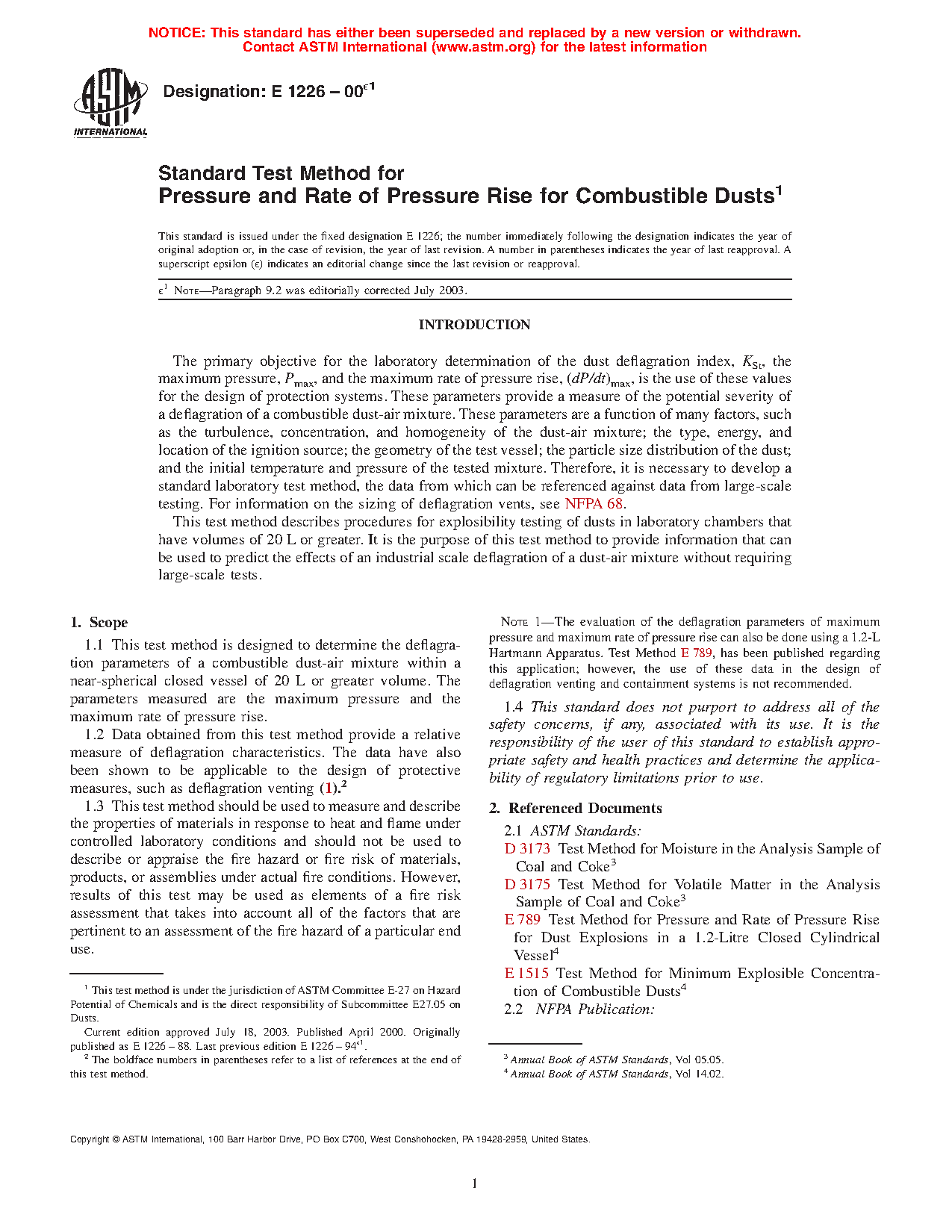 Note 1: Historically, the evaluation of the deflagration parameters of maximum pressure and maximum rate of pressure rise has been performed using a 1.2-L Hartmann Apparatus. Test Method E789, which describes this method, has been withdrawn. The use of data obtained from the test method in the design of explosion protection systems is not recommended.