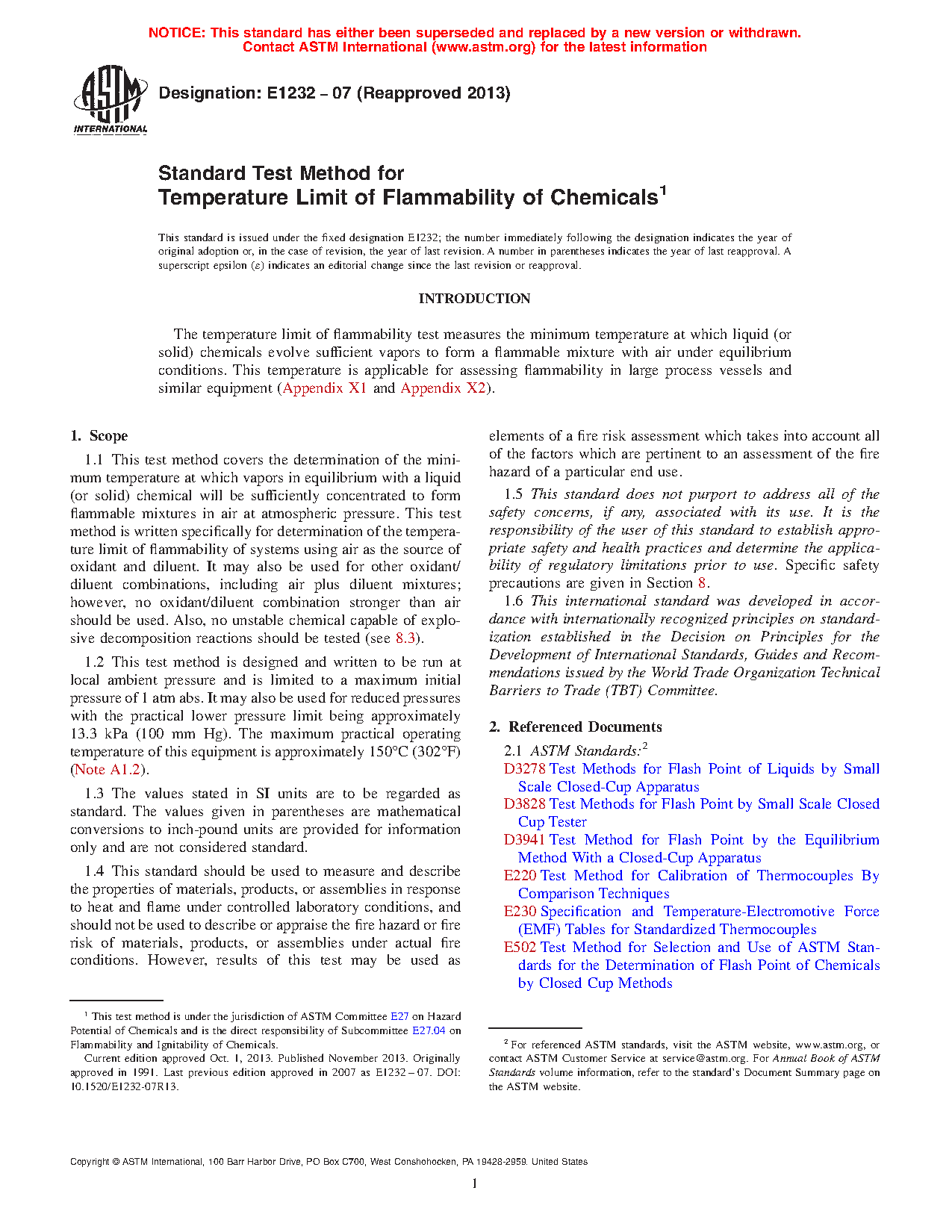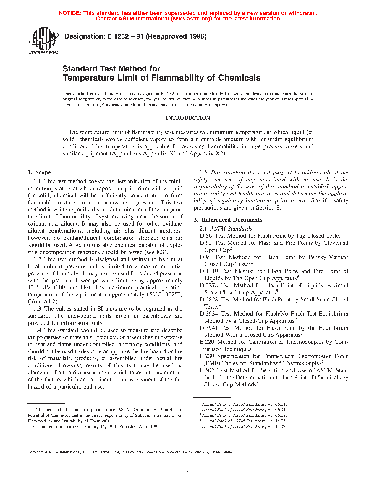 Note 1: As a result of physical factors inherent in flash point apparatus and procedures, closed-cup flash point temperatures are not necessarily the minimum temperature at which a chemical will evolve flammable vapors (see Appendix X2 and Appendix X3, taken in part from Test Method E502). The temperature limit of flammability test is designed to supplement limitations inherent in flash point tests (Appendix X2). It yields a result closely approaching the minimum temperature of flammable vapor formation for equilibrium situations in the chemical processing industry such as in closed process and storage vessels.