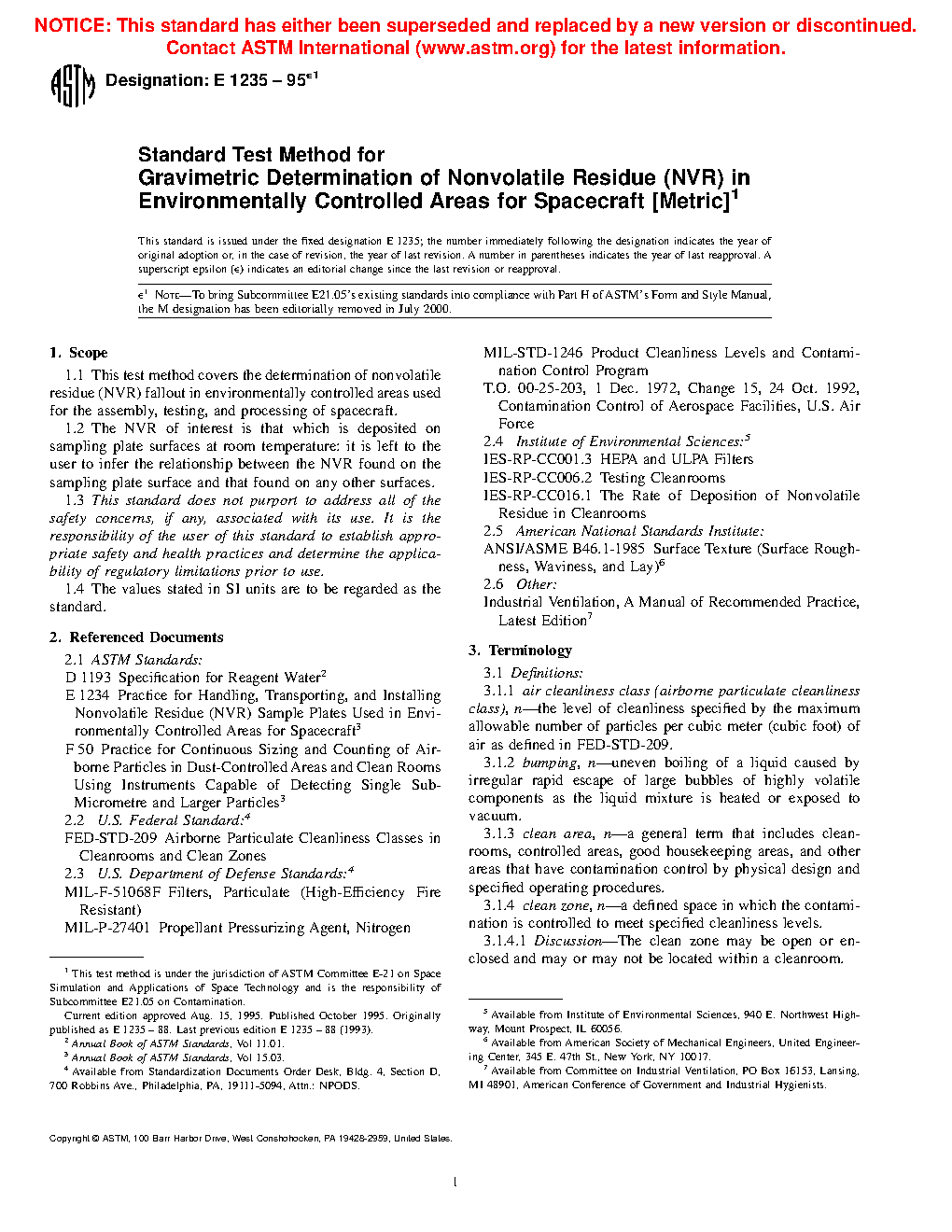1.1 This test method covers the determination of nonvolatile residue (NVR) fallout in environmentally controlled areas used for the assembly, testing, and processing of spacecraft.
