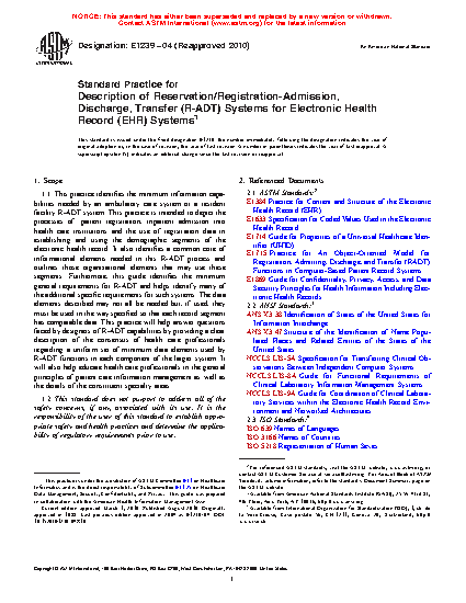 1.1 This practice identifies the minimum information capabilities needed by an ambulatory care system or a resident facility R-ADT system. This practice is intended to depict the processes of: patient registration, inpatient admission into health care institutions and the use of registration data in establishing and using the demographic segments of the electronic health record. It also identifies a common core of informational elements needed in this R-ADT process and outlines those organizational elements that may use these segments. Furthermore, this guide identifies the minimum general requirements for R-ADT and helps identify many of the additional specific requirements for such systems. The data elements described may not all be needed but, if used, they must be used in the way specified so that each record segment has comparable data. This practice will help answer questions faced by designers of R-ADT capabilities by providing a clear description of the consensus of health care professionals regarding a uniform set of minimum data elements used by R-ADT functions in each component of the larger system. It will also help educate health care professionals in the general principles of patient care information management as well as the details of the constituent specialty areas.