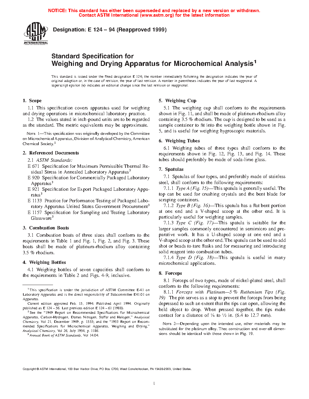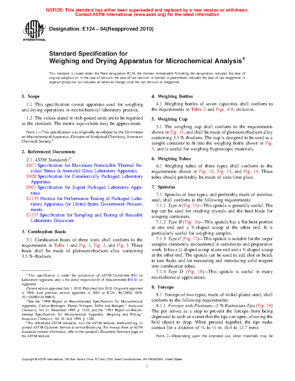 This specification covers the general requirements for the components that comprise the apparatus used for the weighing and drying operations in the laboratory practice of microchemical analysis. The components covered here are the following: combustion boats; weighing bottles, cup, and tubes; spatulas; forceps; tare flasks; metal cooling block; metal crucible container with glass cover; and micro glass desiccator with metal insert.
