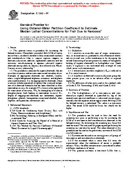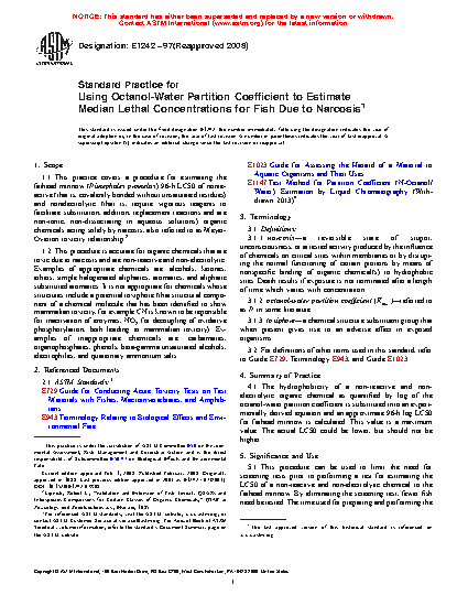 1.1 This practice covers a procedure for estimating the fathead minnow (Pimephales promelas) 96-h LC50 of nonreactive (that is, covalently bonded without unsaturated residues) and nonelectrolytic (that is, require vigorous reagents to facilitate substitution, addition, replacement reactions and are non-ionic, non-dissociating in aqueous solutions) organic chemicals acting solely by narcosis, also referred to as Meyer-Overton toxicity relationship.