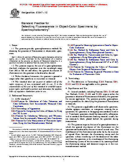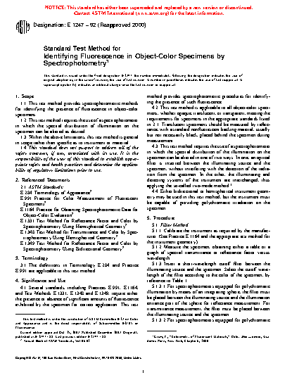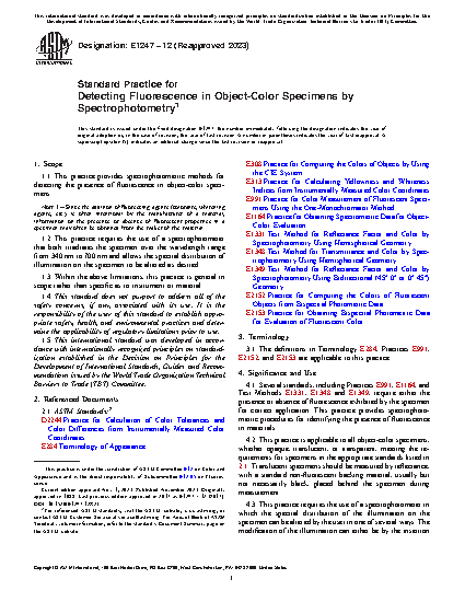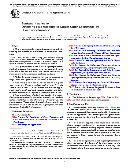 1.1 This practice provides spectrophotometric methods for detecting the presence of fluorescence in object-color specimens.