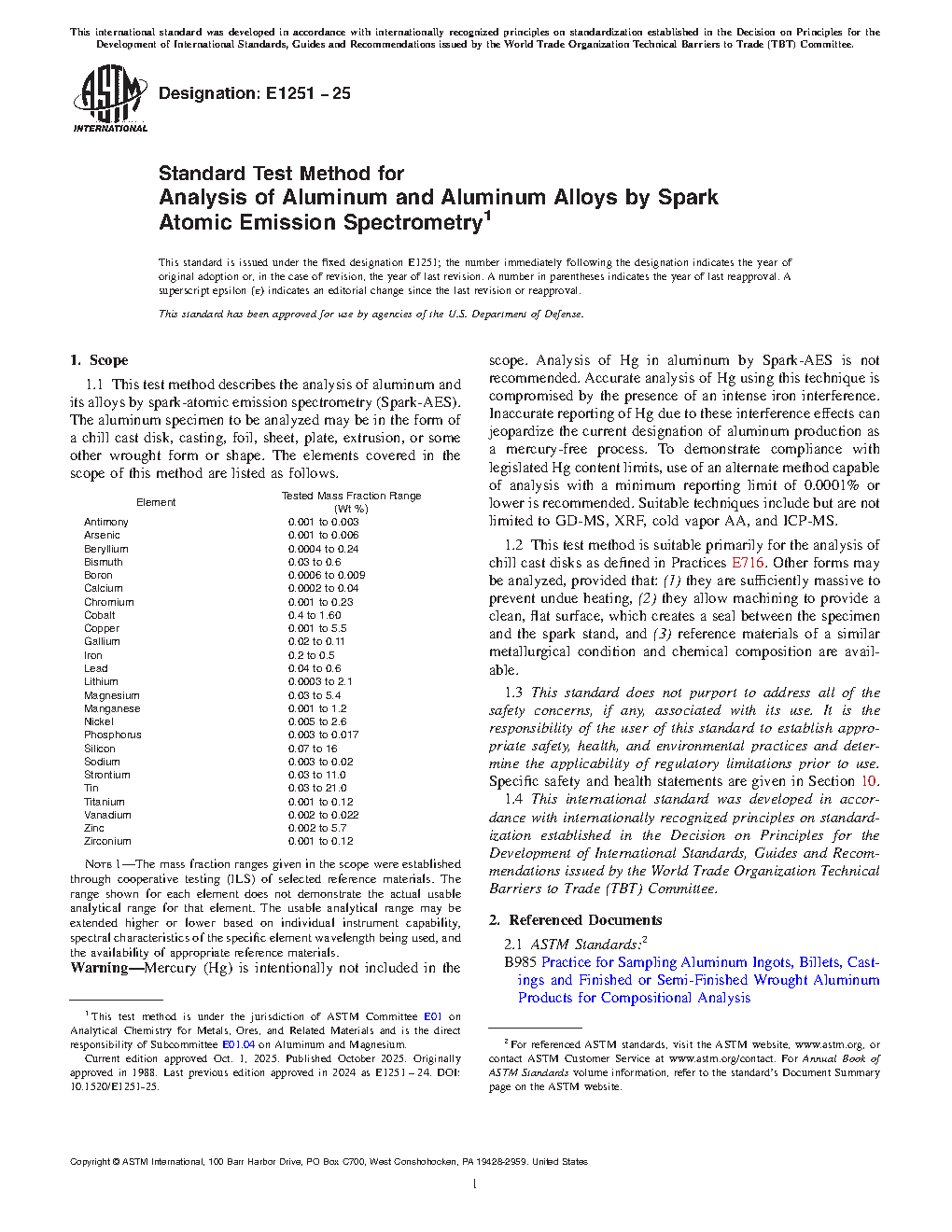 Note 2: Mercury (Hg) is intentionally not included in the scope. Analysis of Hg in aluminum by spark atomic emission spectrometry (Spark-AES) is not recommended. Accurate analysis of Hg using this technique is compromised by the presence of an intense iron interference. Inaccurate reporting of Hg due to these interference effects can jeopardize the current designation of aluminum production as a mercury-free process. To demonstrate compliance with legislated Hg content limits, use of an alternate method capable of analysis with a minimum reporting limit of 0.0001% or lower is recommended. Suitable techniques include but are not limited to glow discharge mass spectrometry, XRF, and cold vapor AA.