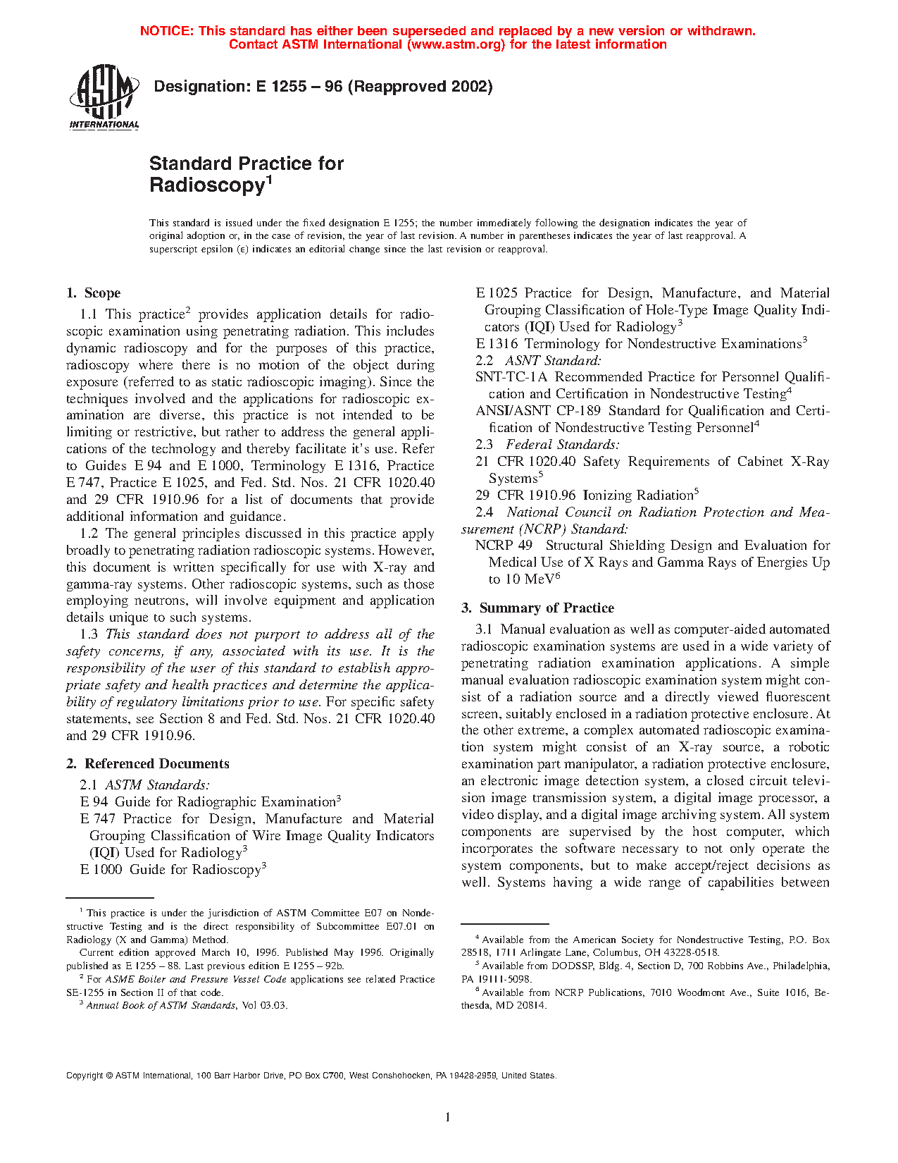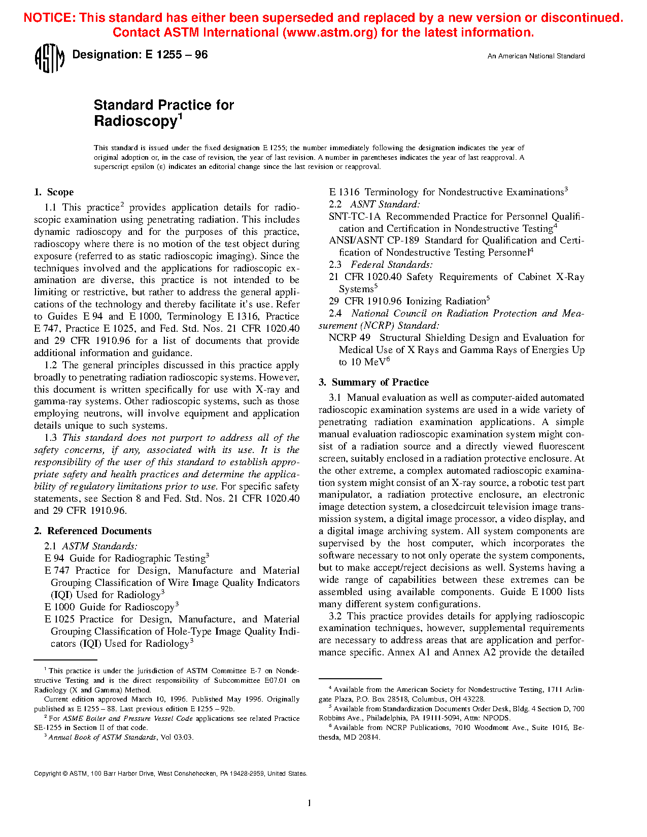 1.2 This practice establishes the minimum requirements for radioscopic examination of metallic and non-metallic materials using X-ray or gamma radiation. Since the techniques involved and the applications for radioscopic examination are diverse, this practice is not intended to be limiting or restrictive, but rather to address the general applications of the technology and thereby facilitate its use. Refer to Guides E94 and E1000, and Terminology E1316, provide additional information and guidance.