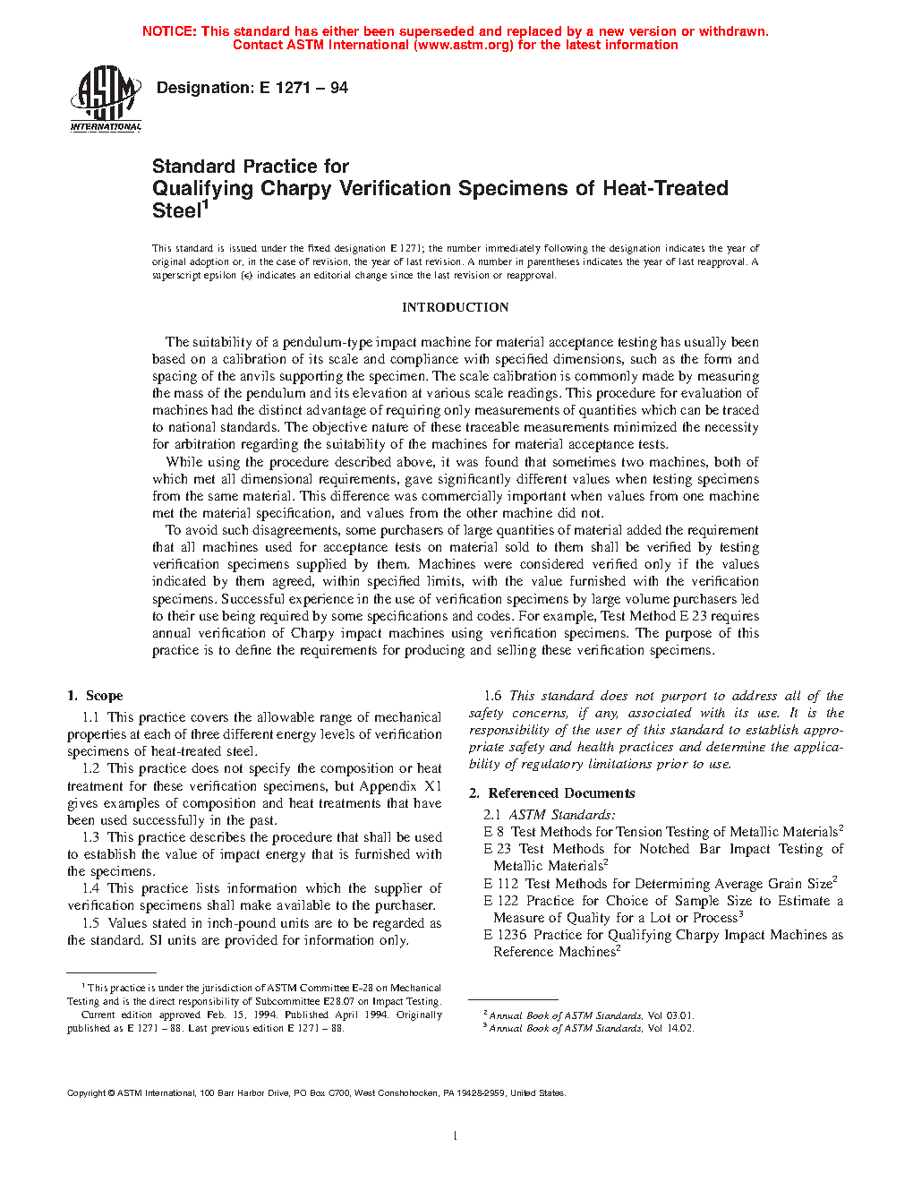 1.1 This practice covers the allowable range of mechanical properties at each of three different energy levels of verification specimens of heat-treated steel.