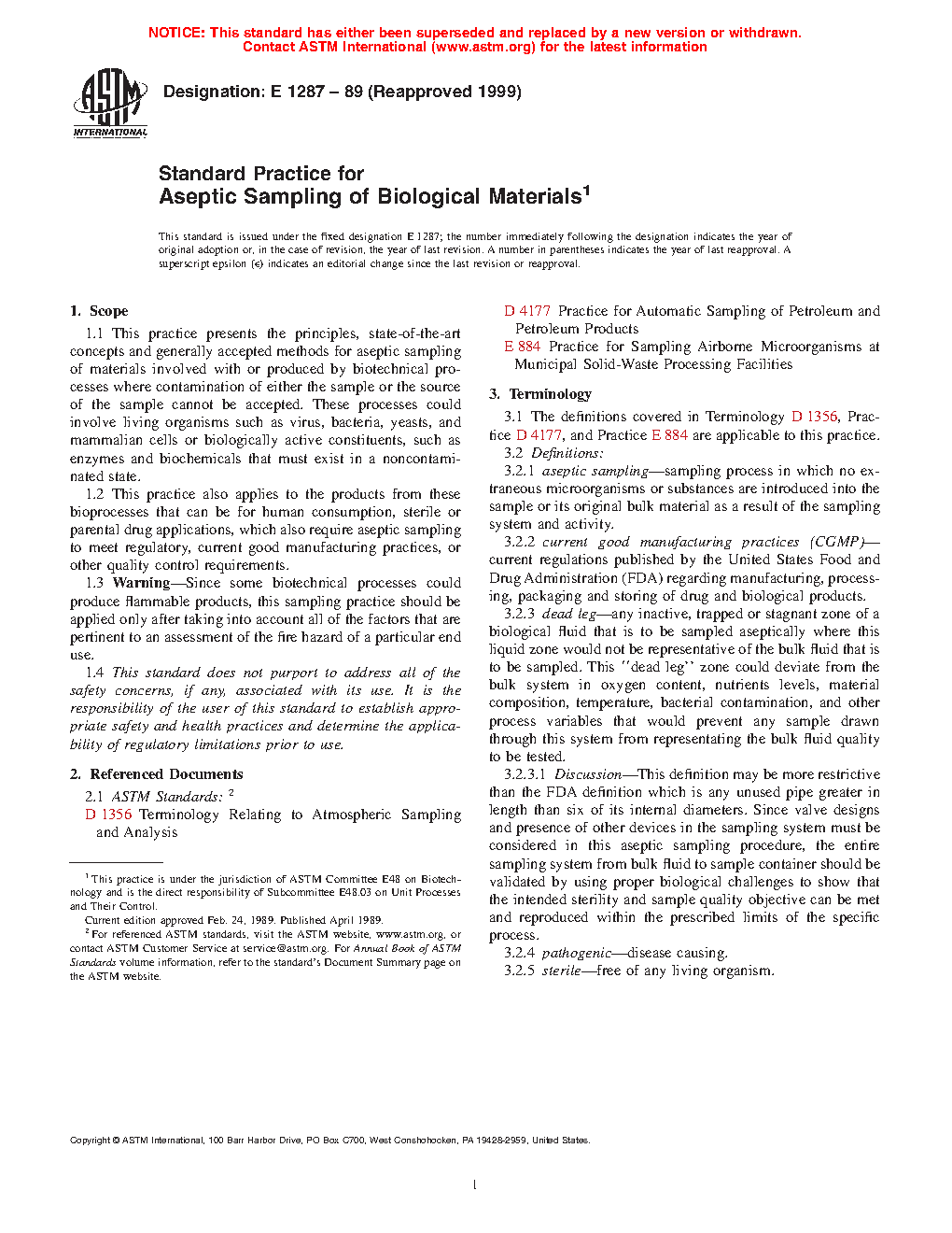1.1 This practice presents the principles, state-of-the-art concepts and generally accepted methods for aseptic sampling of materials involved with or produced by biotechnical processes where contamination of either the sample or the source of the sample cannot be accepted. These processes could involve living organisms such as virus, bacteria, yeasts, and mammalian cells or biologically active constituents, such as enzymes and biochemicals that must exist in a noncontaminated state.