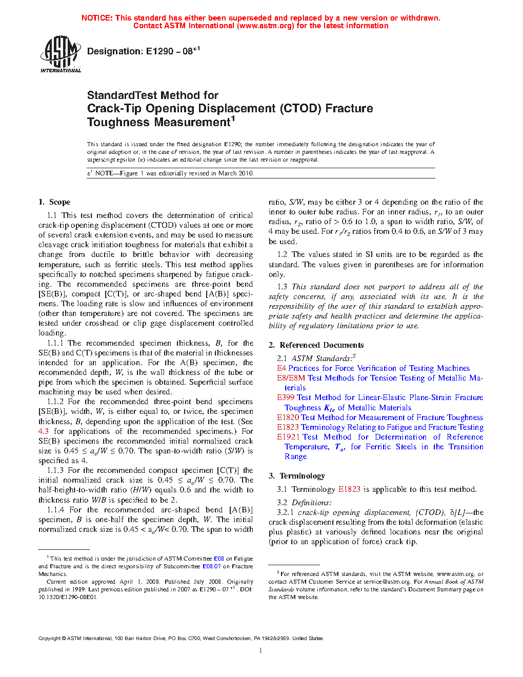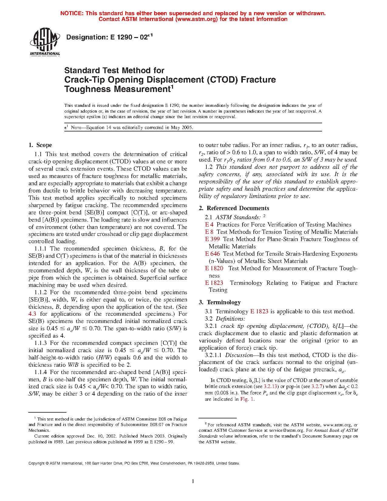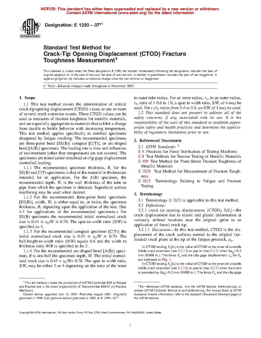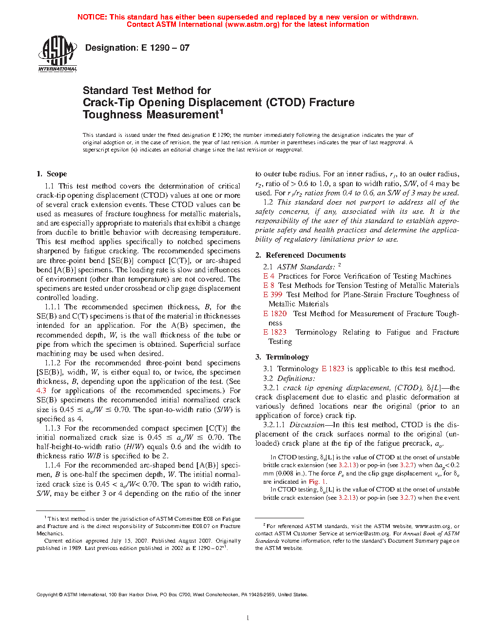 1.1 This test method covers the determination of critical crack-tip opening displacement (CTOD) values at one or more of several crack extension events. These CTOD values can be used as measures of fracture toughness for metallic materials, and are especially appropriate to materials that exhibit a change from ductile to brittle behavior with decreasing temperature. This test method applies specifically to notched specimens sharpened by fatigue cracking. The recommended specimens are three-point bend [SE(B)] compact [C(T)], or arc-shaped bend [A(B)] specimens. The loading rate is slow and influences of environment (other than temperature) are not covered. The specimens are tested under crosshead or clip gage displacement controlled loading.