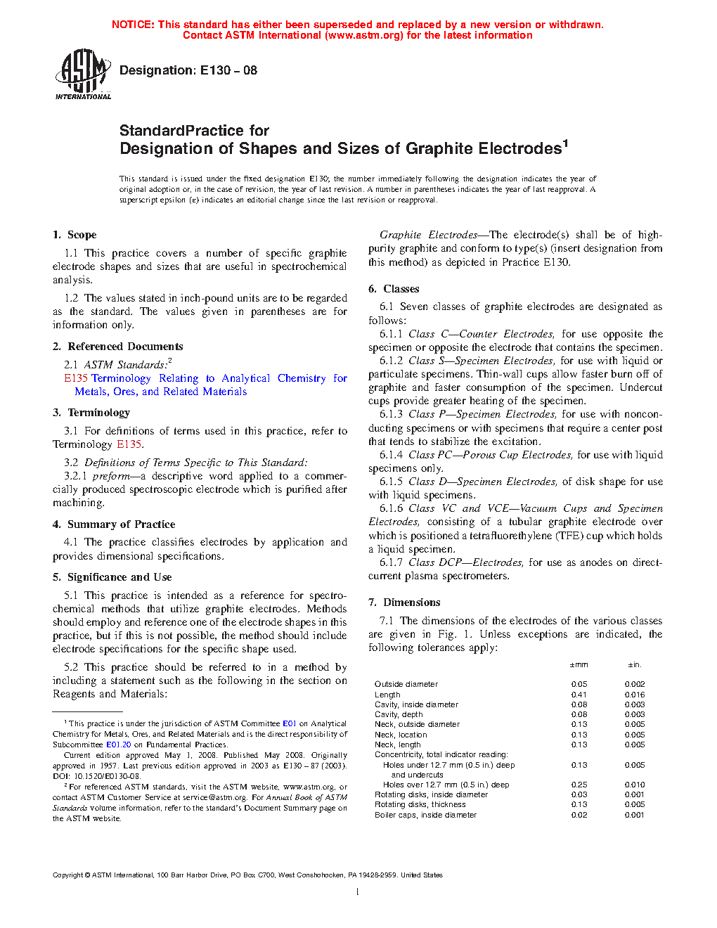 This practice is intended as a reference for spectrochemical methods that utilize graphite electrodes. Methods should employ and reference one of the electrode shapes in this practice, but if this is not possible, the method should include electrode specifications for the specific shape used.