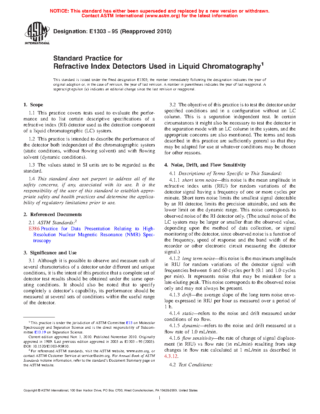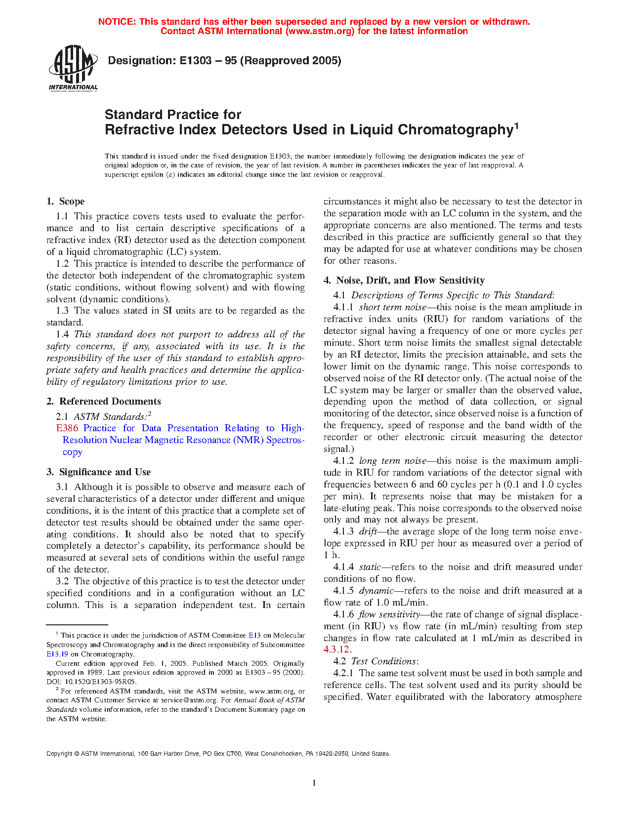 1.1 This practice covers tests used to evaluate the performance and to list certain descriptive specifications of a refractive index (RI) detector used as the detection component of a liquid chromatographic (LC) system.