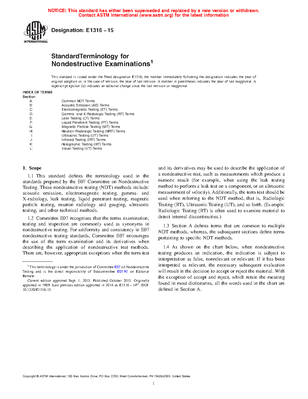 1.1 This standard defines the terminology used in the standards prepared by the E07 Committee on Nondestructive Testing. These nondestructive testing (NDT) methods include: acoustic emission, electromagnetic testing, gamma- and X-radiology, leak testing, liquid penetrant testing, magnetic particle testing, neutron radiology and gauging, ultrasonic testing, and other technical methods.
