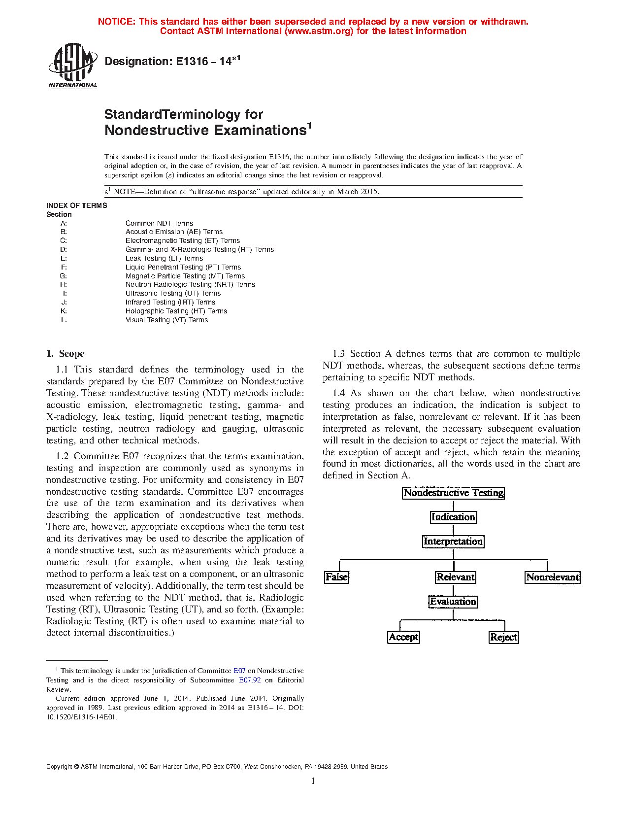 1.4 As shown on the chart below, when a nondestructive examination or inspection produces an indication, the indication is subject to interpretation as false, nonrelevant, or relevant. If it has been interpreted as relevant, the necessary subsequent evaluation will result in the decision to accept or reject the material. With the exception of accept and reject, which retain the meaning found in most dictionaries, all the words used in the chart are defined in Section A.