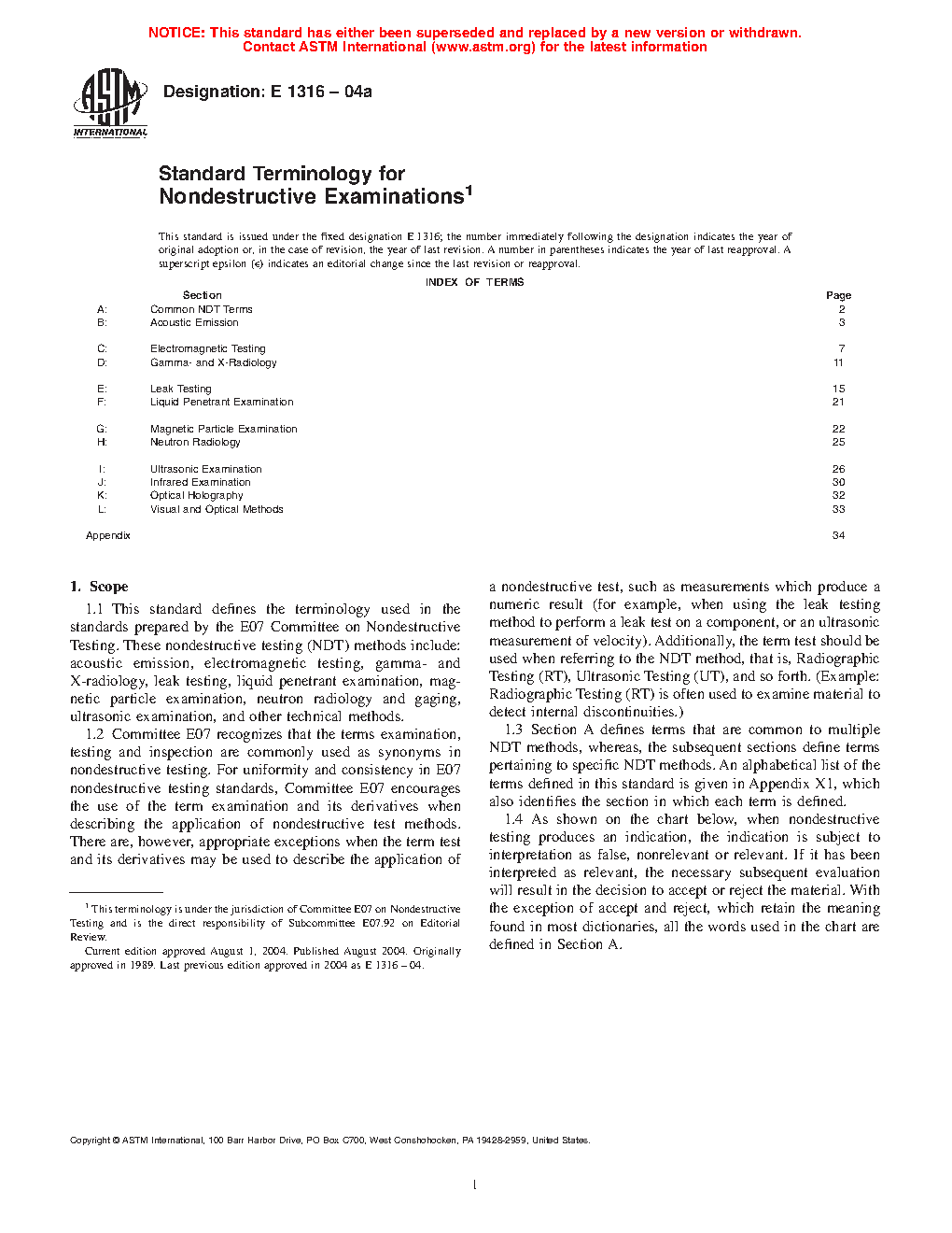1.1 This standard covers the terminology used in the standards prepared by the E07 Committee on Nondestructive Testing. These nondestructive testing (NDT) methods include: acoustic emission, electromagnetic testing, gamma- and X-radiology, leak testing, liquid penetrant testing, magnetic particle testing, neutron radiology and gauging, ultrasonic testing, and other technical methods.