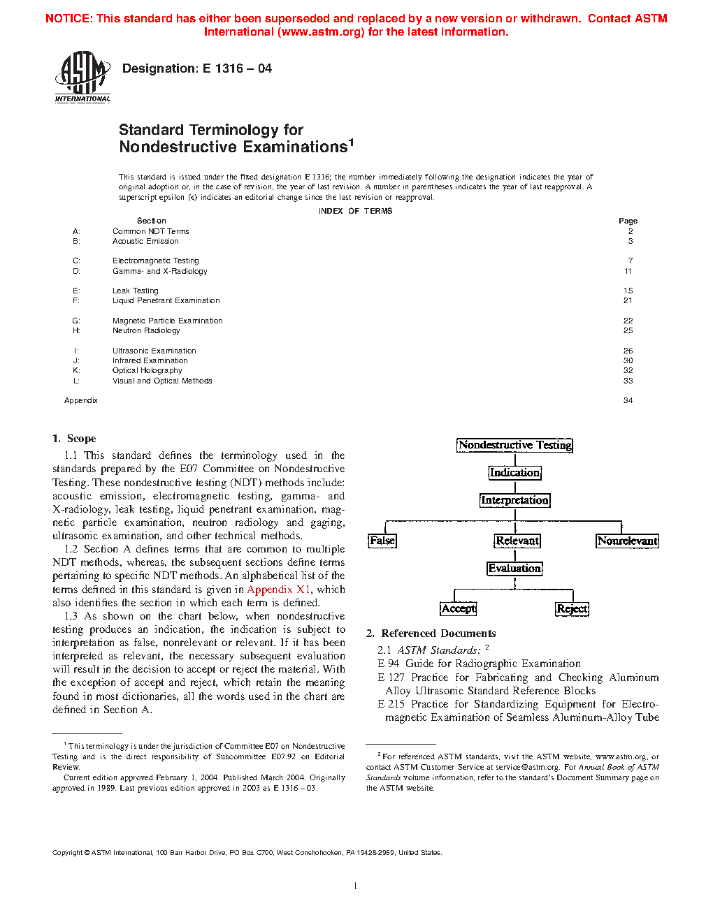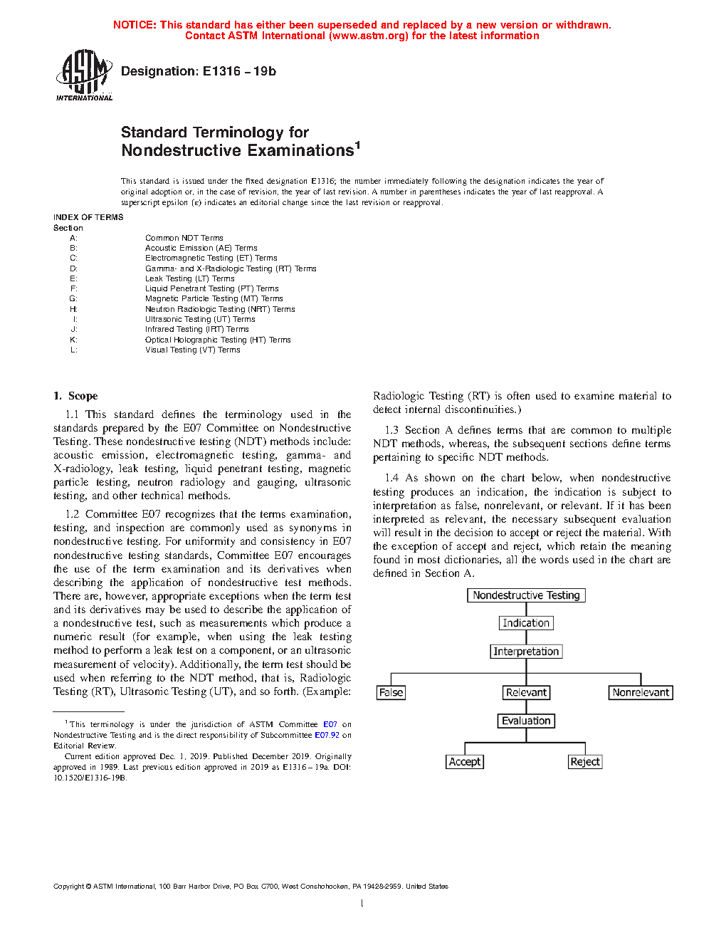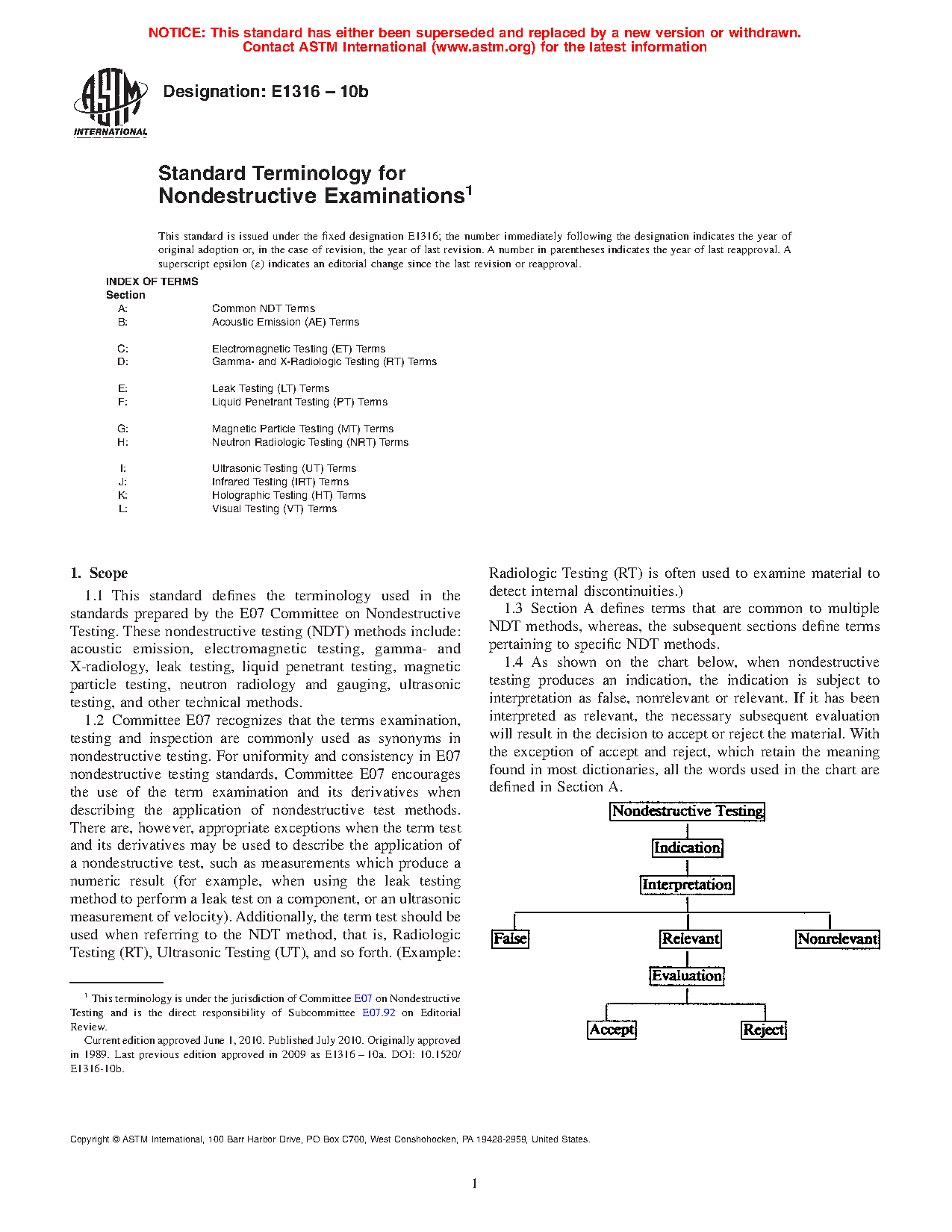 1.4 As shown on the chart below, when a nondestructive examination or inspection produces an indication, the indication is subject to interpretation as false, nonrelevant, or relevant. If it has been interpreted as relevant, the necessary subsequent evaluation will result in the decision to accept or reject the material. With the exception of accept and reject, which retain the meaning found in most dictionaries, all the words used in the chart are defined in Section A.