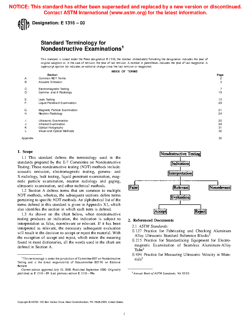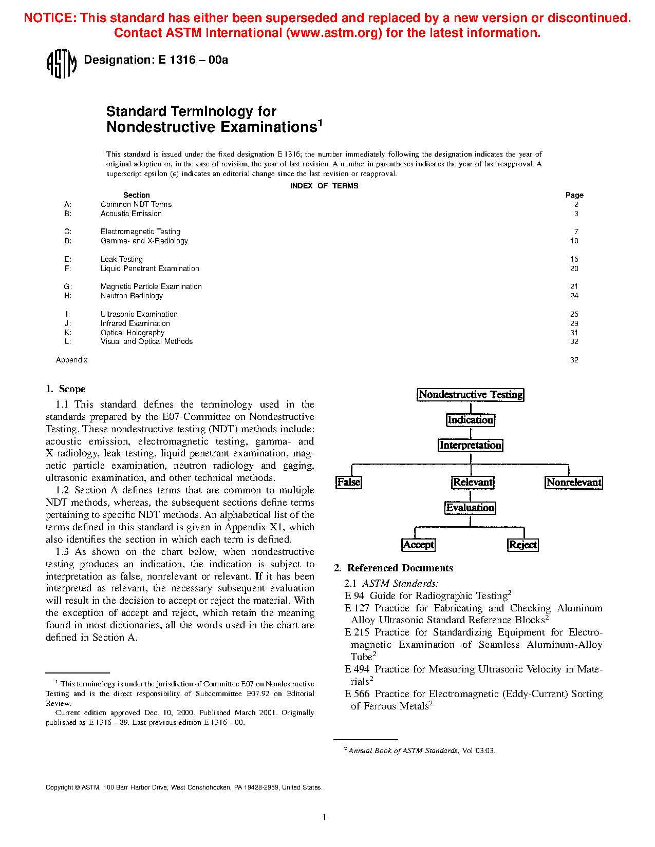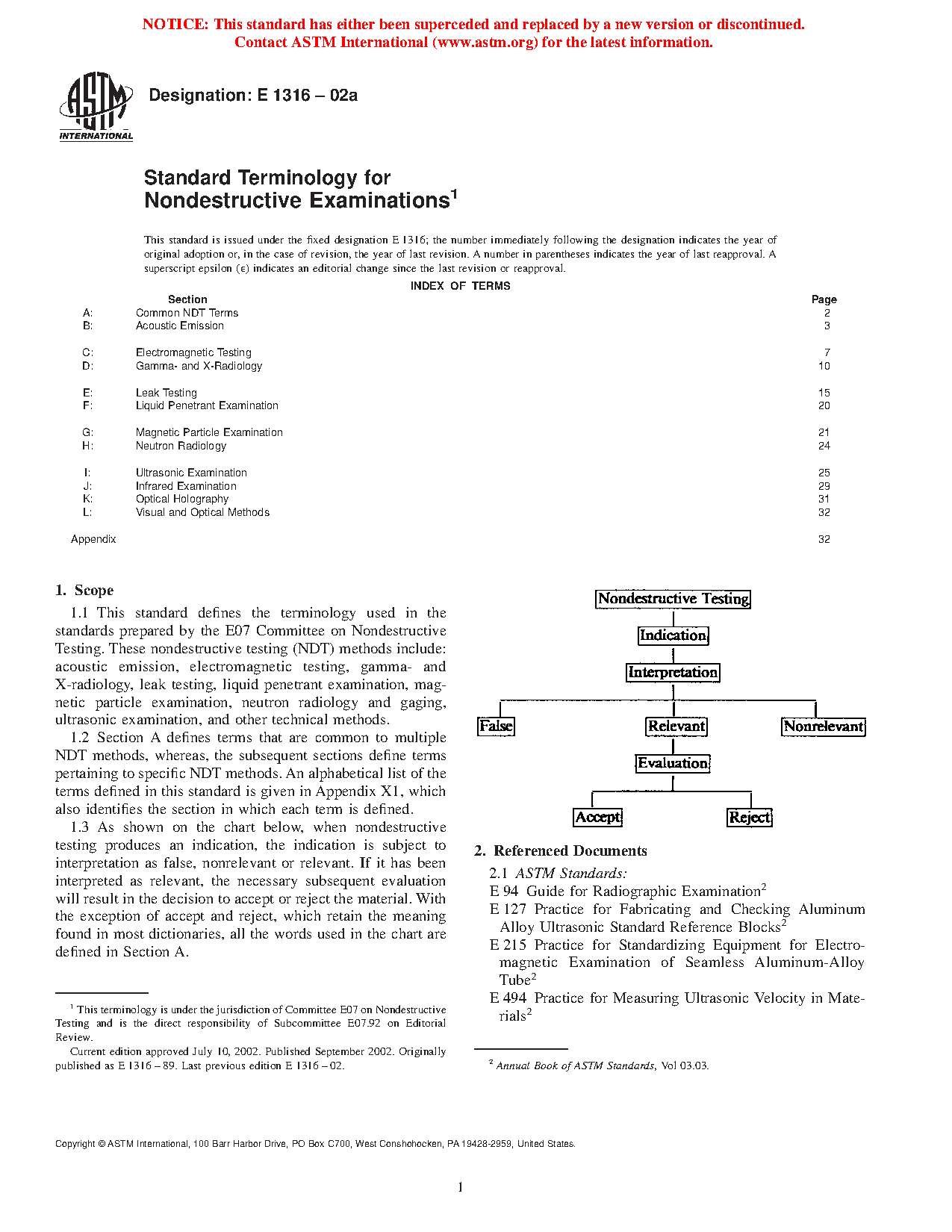 1.4 As shown on the chart below, when a nondestructive examination or inspection produces an indication, the indication is subject to interpretation as false, nonrelevant, or relevant. If it has been interpreted as relevant, the necessary subsequent evaluation will result in the decision to accept or reject the material. With the exception of accept and reject, which retain the meaning found in most dictionaries, all the words used in the chart are defined in Section A.