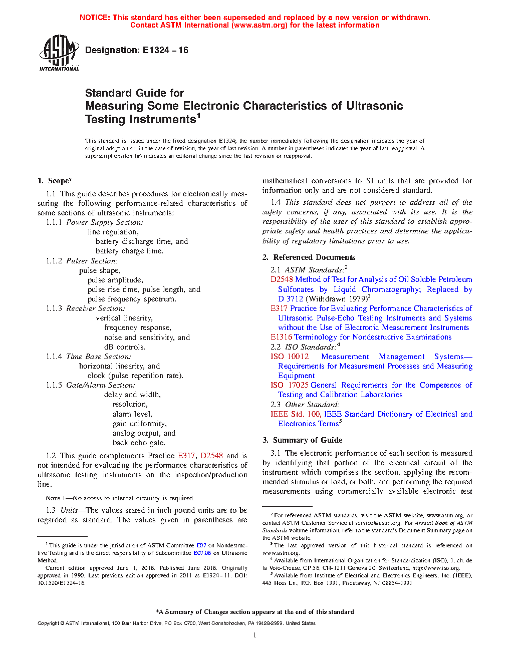 1.2 This guide complements Practice E317, D2548 and is not intended for evaluating the performance characteristics of ultrasonic testing instruments on the inspection/production line.