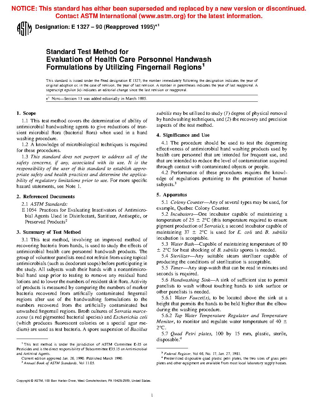 4.1 The procedure should be used to test the degerming effectiveness of antimicrobial hand washing products used by health care personnel that are intended for frequent use, and that are intended to reduce the level of contamination acquired through contact with contaminated objects or people.