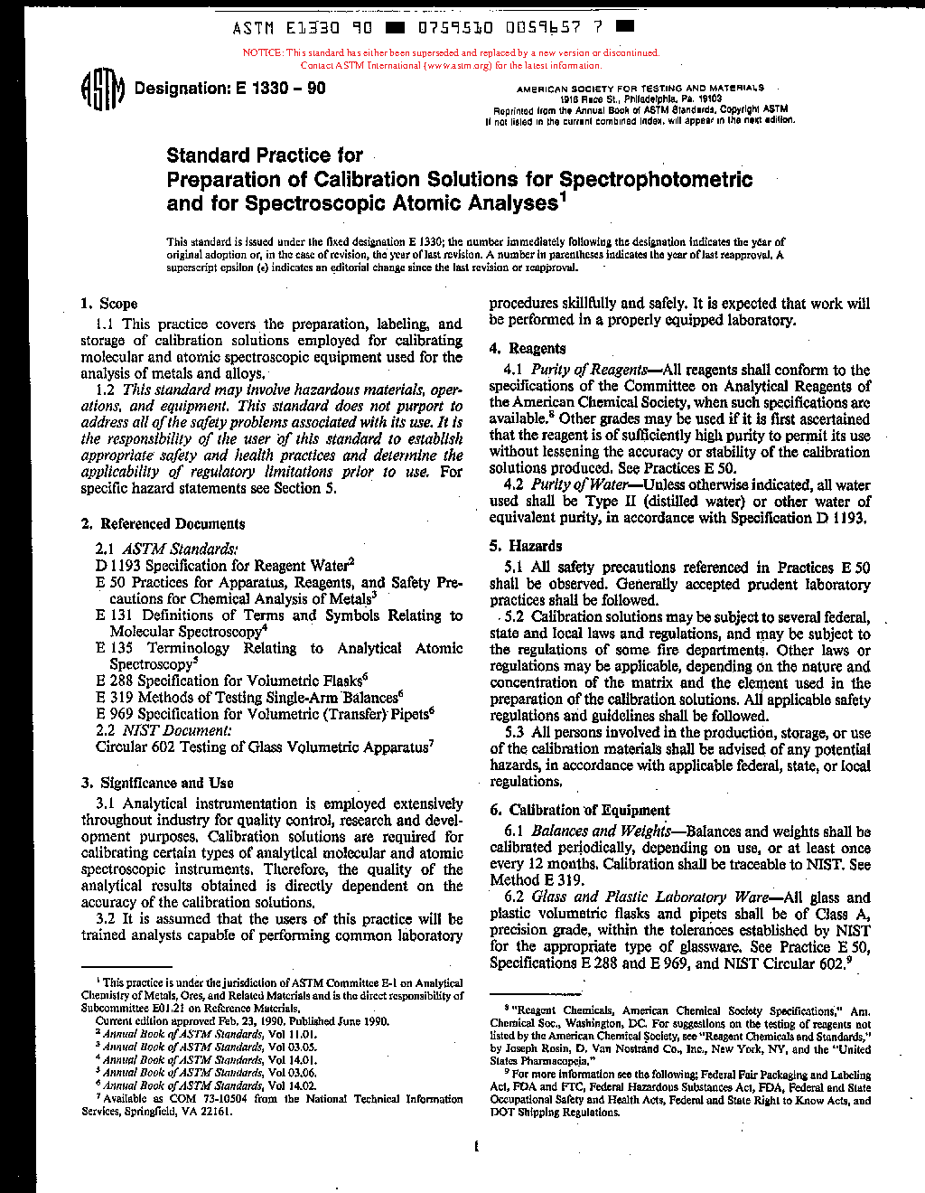 Practice for Preparation of Calibration Solutions for Spectrophotometric and for Spectroscopic Atomic Analyses (Withdrawn 1993)