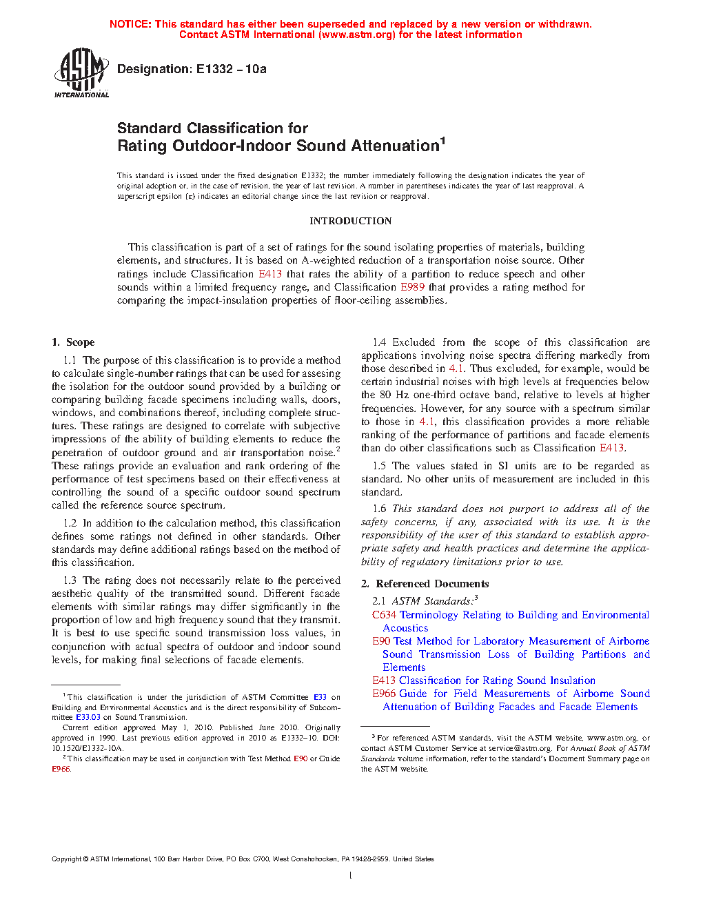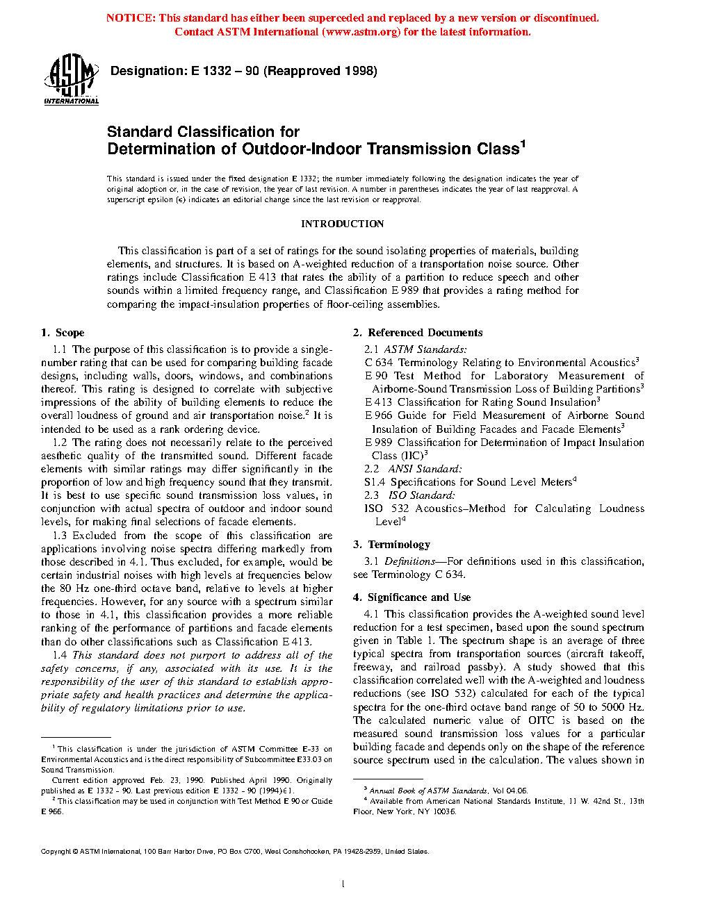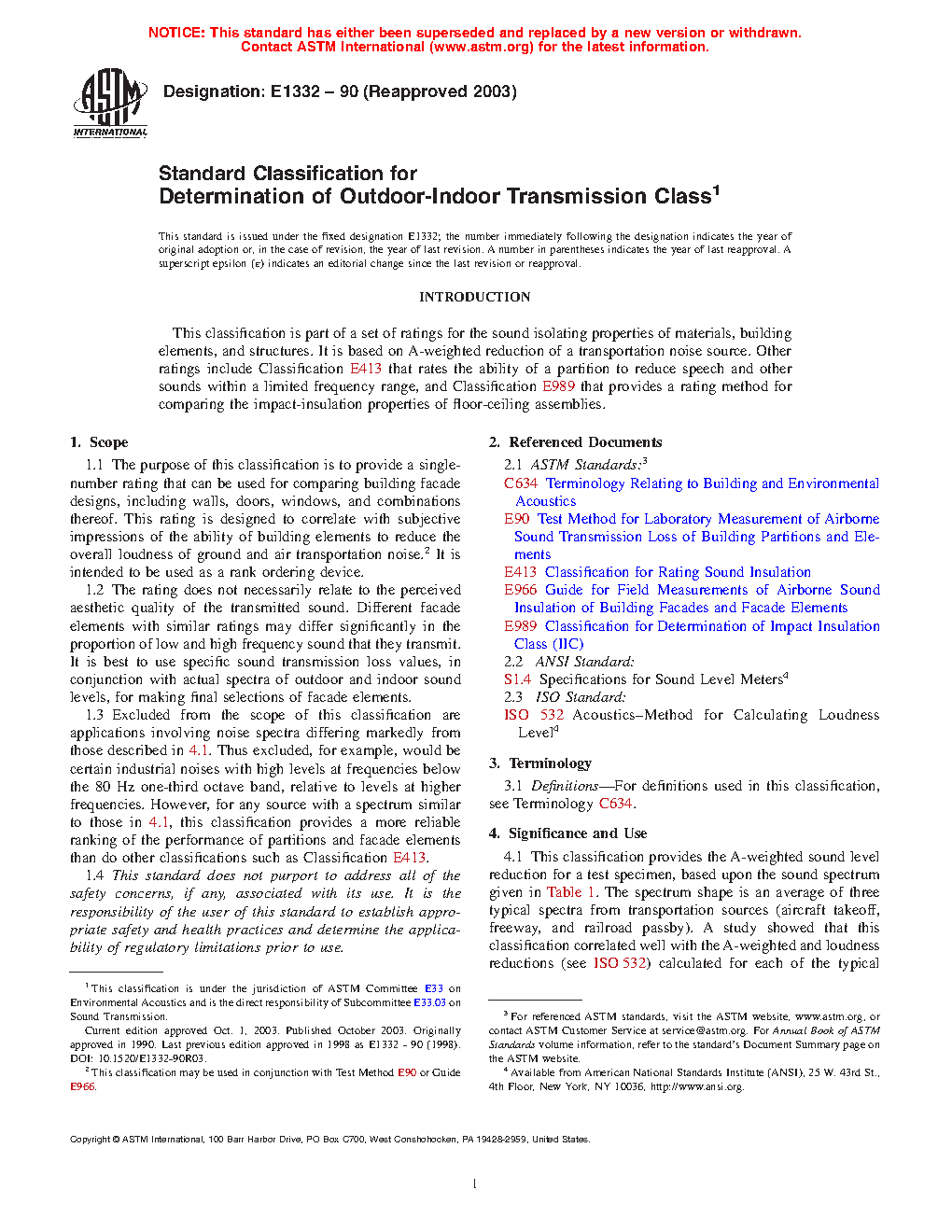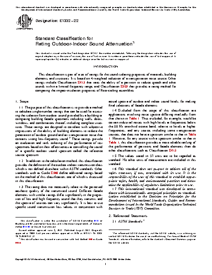1.2 In addition to the calculation method, this classification provides the definition of the outdoor-indoor transmission class which is not defined elsewhere within ASTM standards. Other standards such as Guide E966 define additional ratings based on the method of this classification, one of which is discussed in this classification.