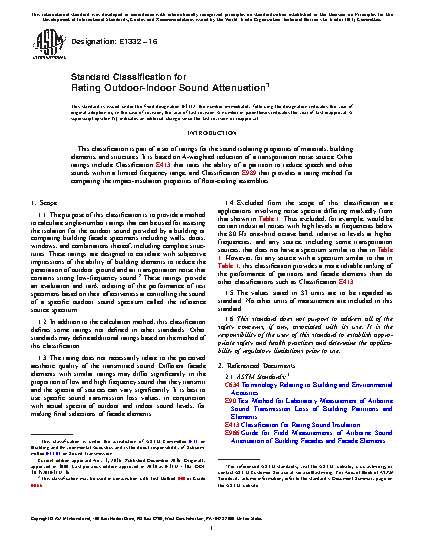 1.3 The rating does not necessarily relate to the perceived aesthetic quality of the transmitted sound. Different facade elements with similar ratings differ significantly in the proportion of low and high frequency sound that they transmit, and the spectra of sources can vary significantly. It is best to use specific sound transmission loss values, in conjunction with actual spectra of outdoor and indoor sound levels, for making final selections of facade elements.