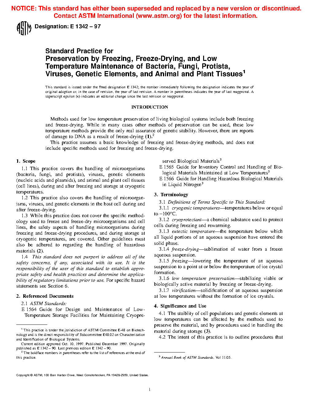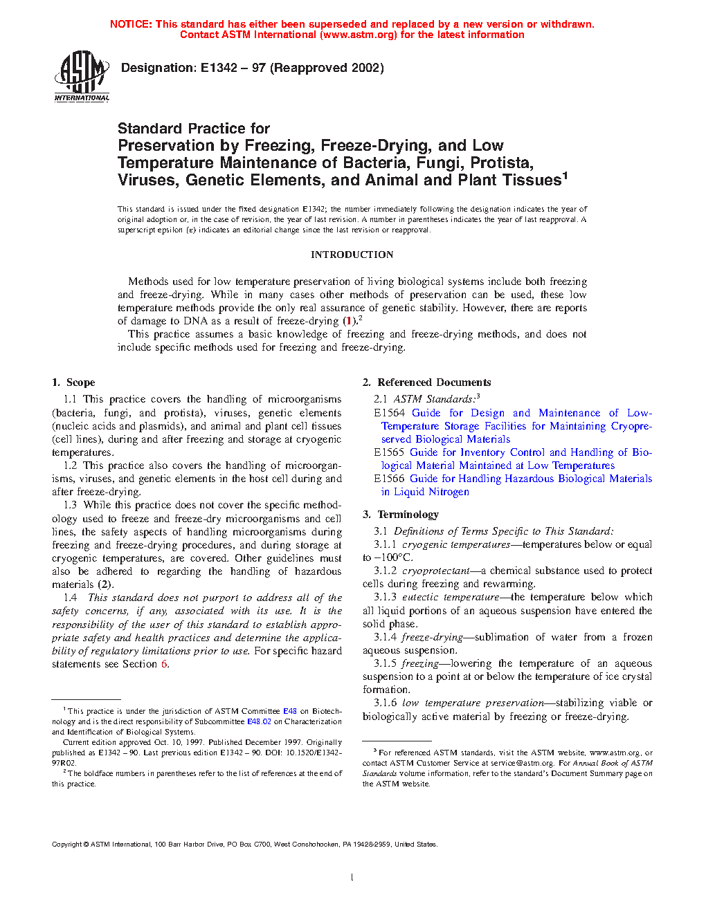 1.3 While this practice does not cover the specific methodology used to freeze and freeze-dry microorganisms and cell lines, the safety aspects of handling microorganisms during freezing and freeze-drying procedures, and during storage at cryogenic temperatures, are covered. Other guidelines must also be adhered to regarding the handling of hazardous materials (2).