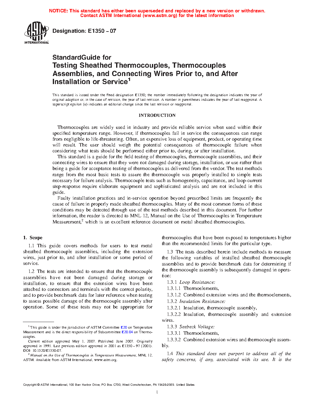 1.3 The tests described herein include methods to measure the following variables of installed sheathed thermocouple assemblies and to provide benchmark data for determining if the thermocouple assembly is subsequently damaged in operation: