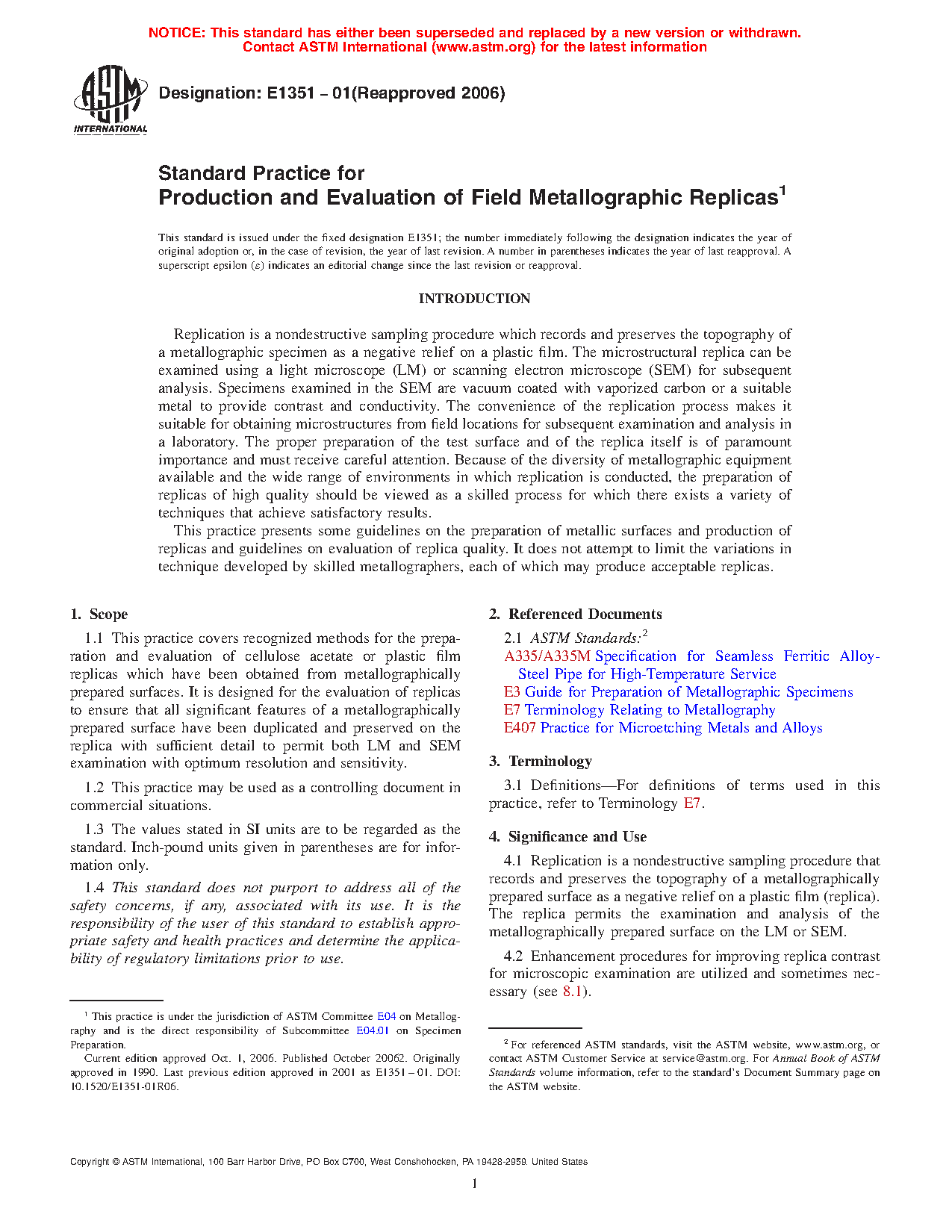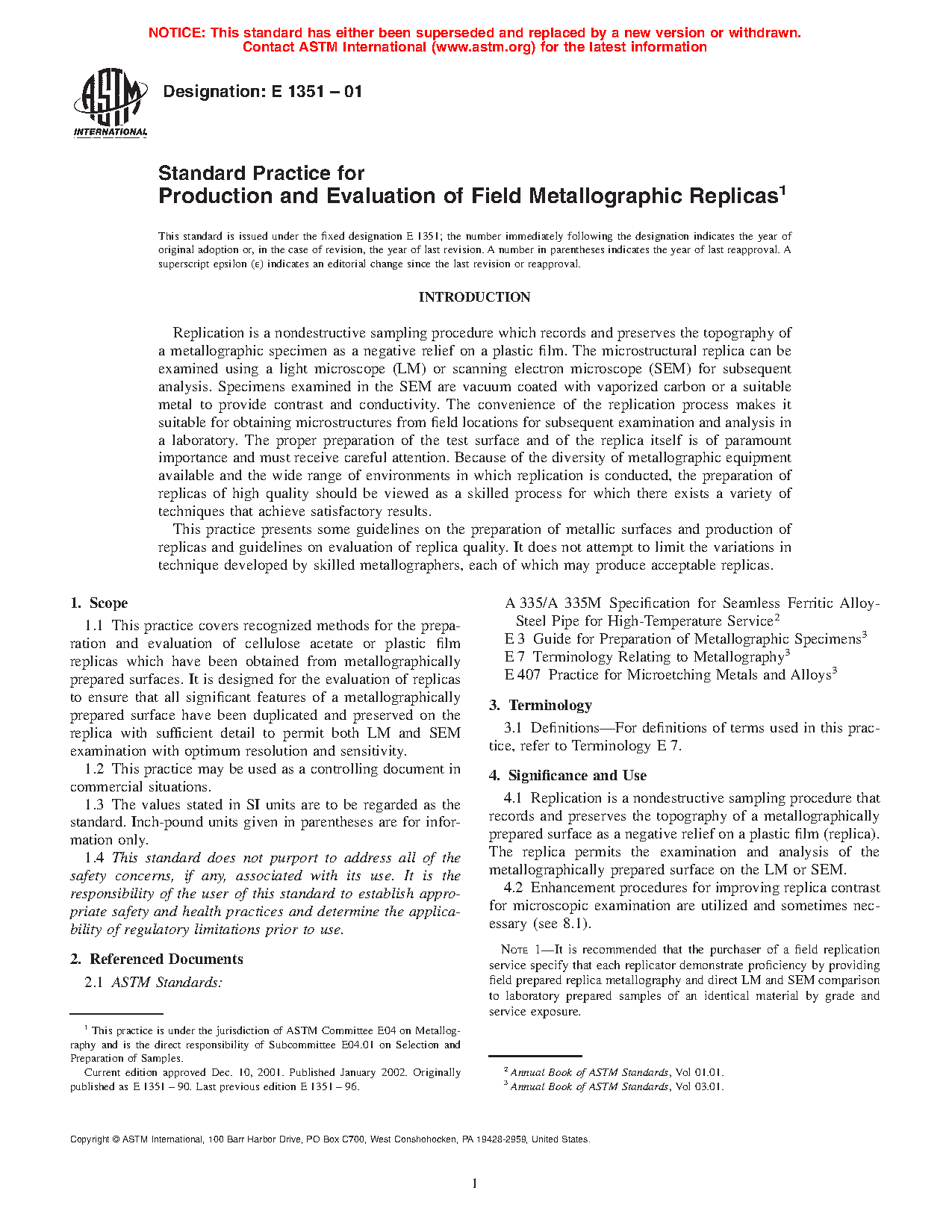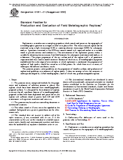 1.1 This practice covers recognized methods for the preparation and evaluation of cellulose acetate or plastic film replicas which have been obtained from metallographically prepared surfaces. It is designed for the evaluation of the metallographic replica to ensure that all significant features of a metallographically prepared surface have been duplicated and preserved on the replica with sufficient detail to permit both LM and SEM examination with optimum resolution and sensitivity.