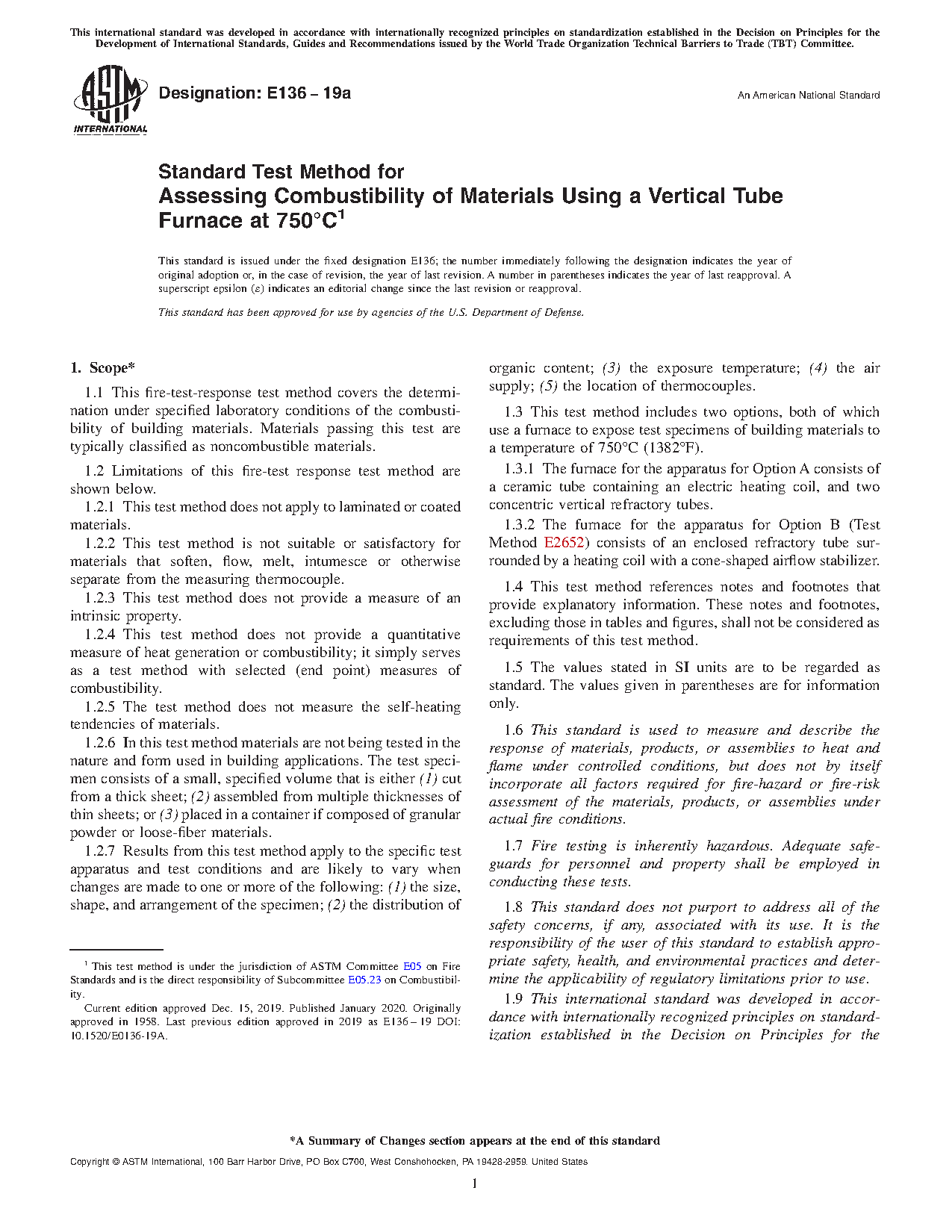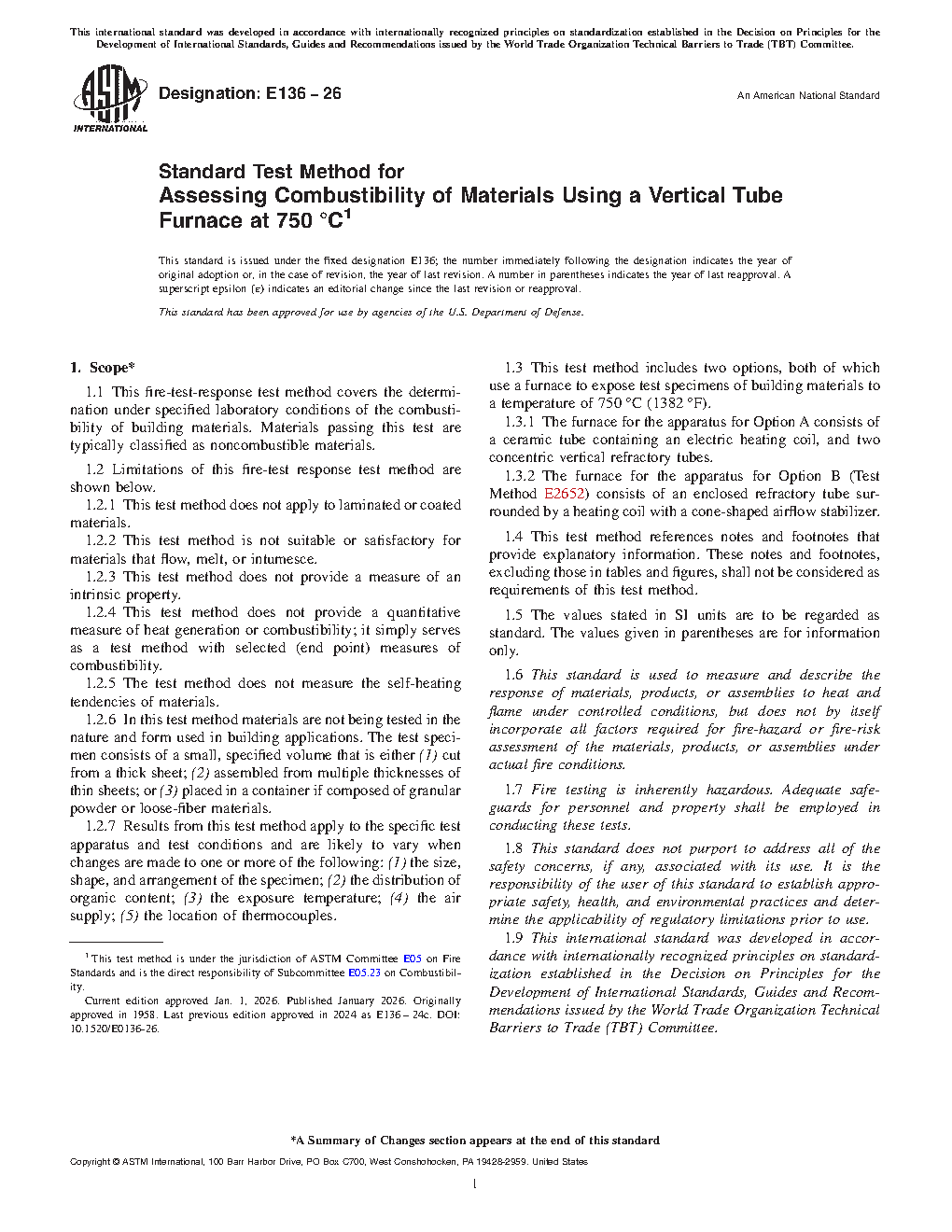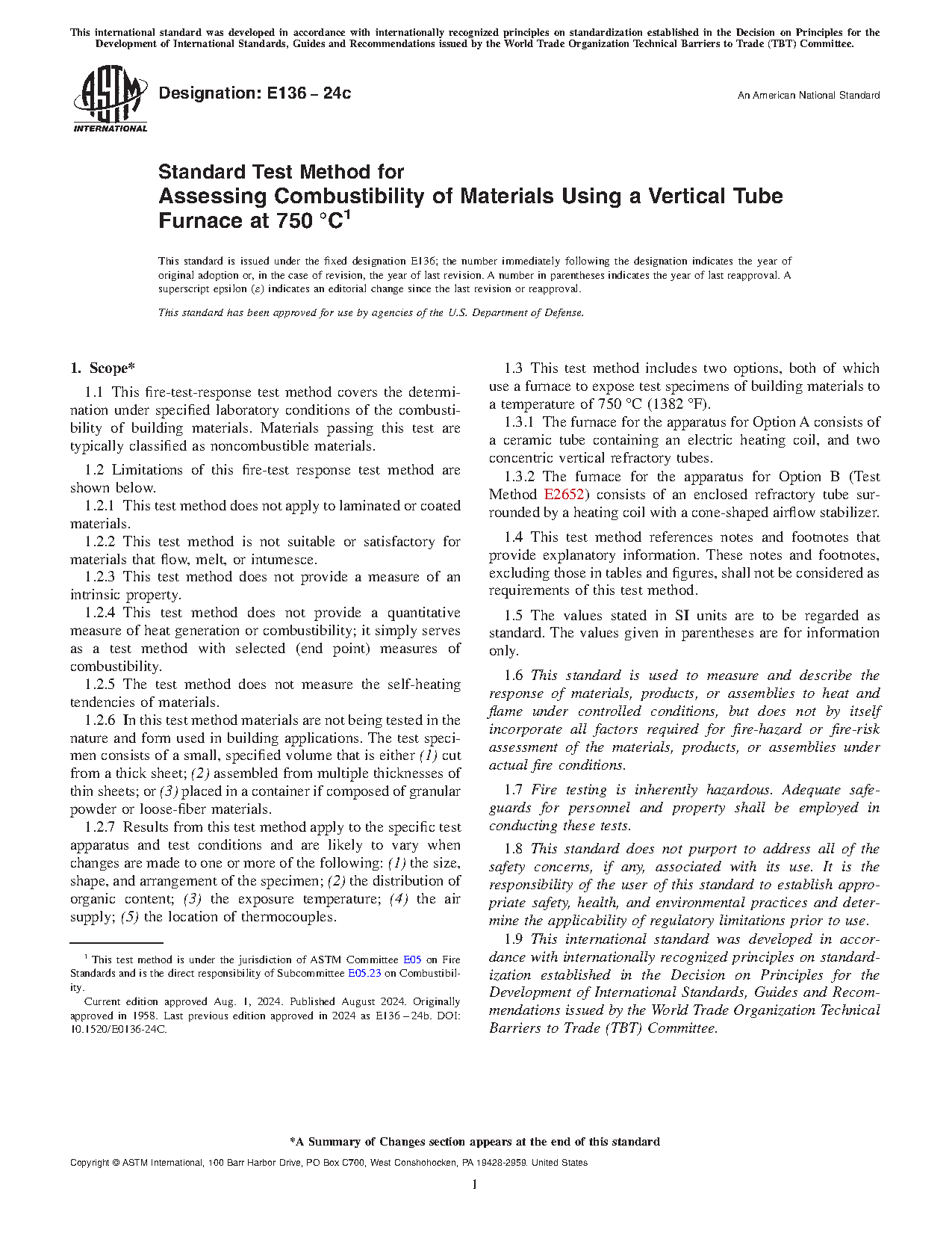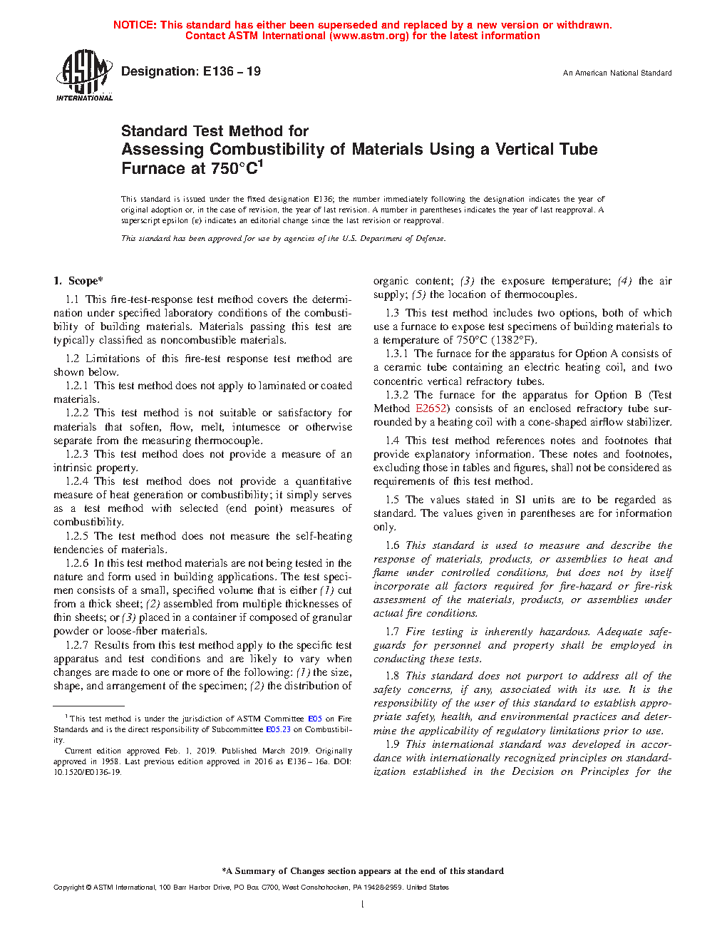 1.3 This test method includes two options, both of which use a furnace to expose test specimens of building materials to a temperature of 750°C (1382°F).
