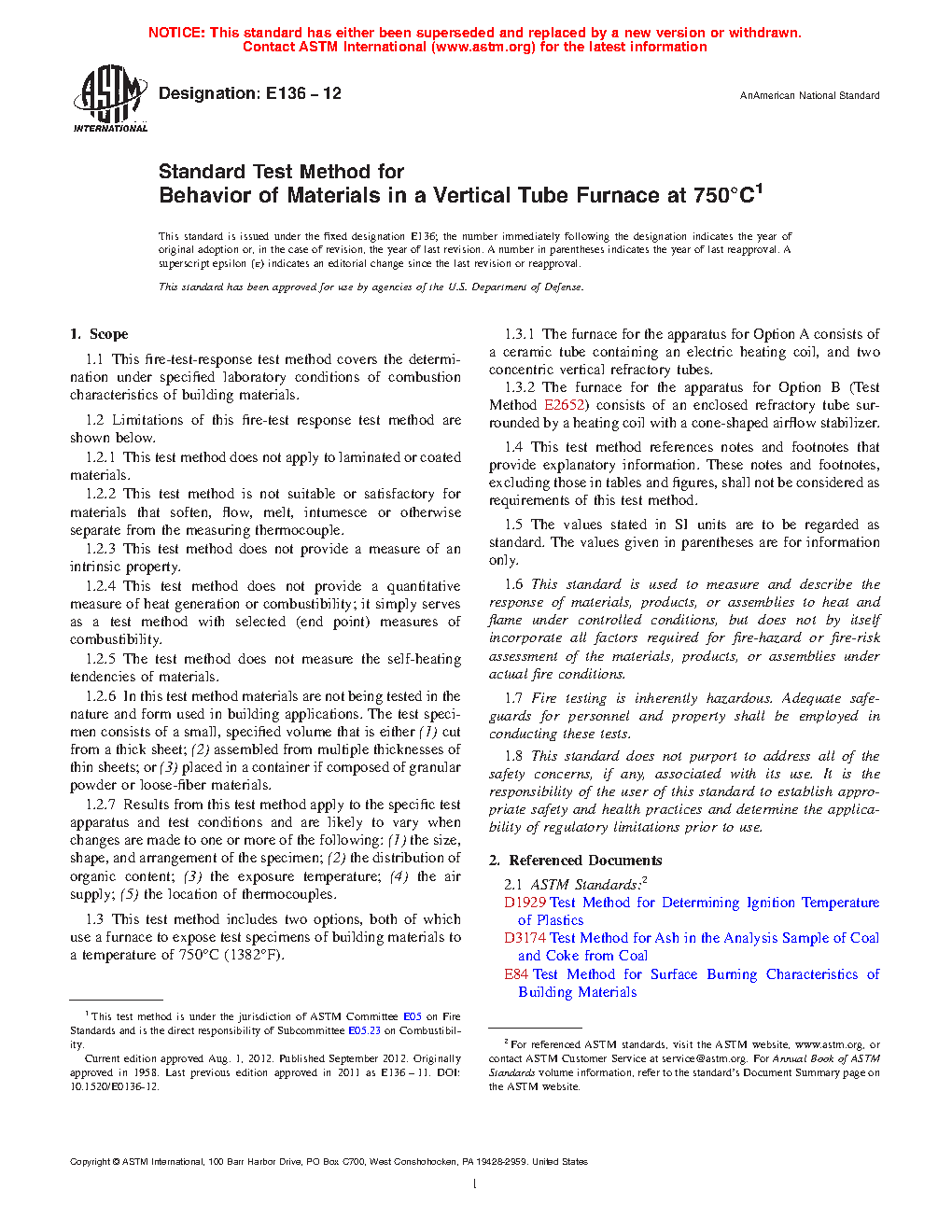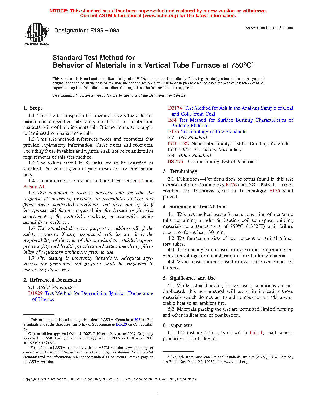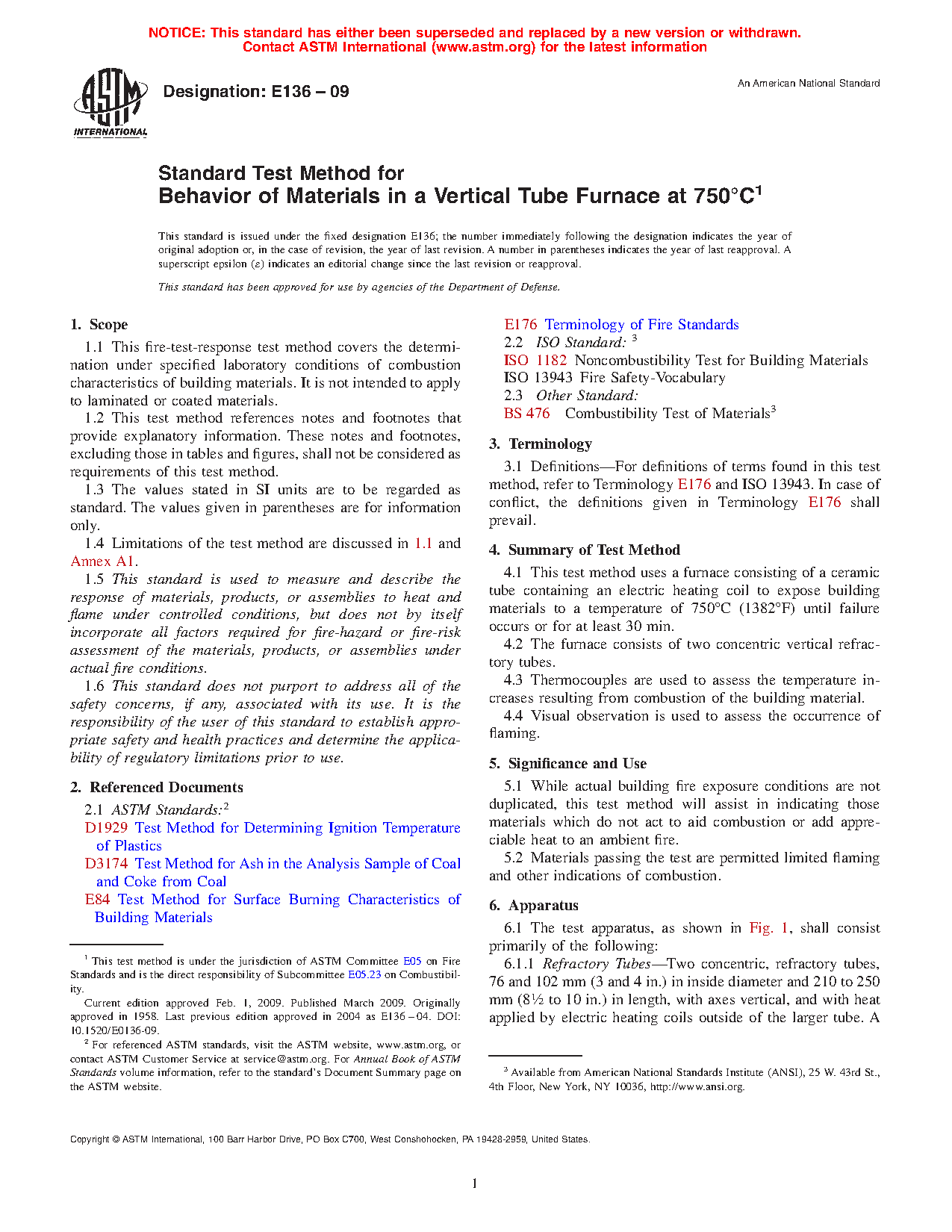 1.3 This test method includes two options, both of which use a furnace to expose test specimens of building materials to a temperature of 750°C (1382°F).
