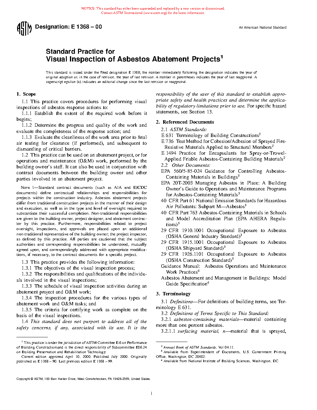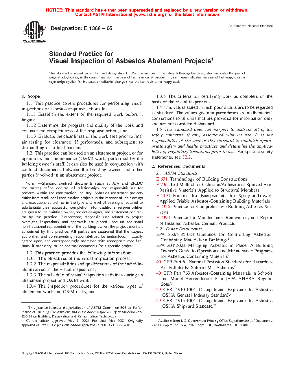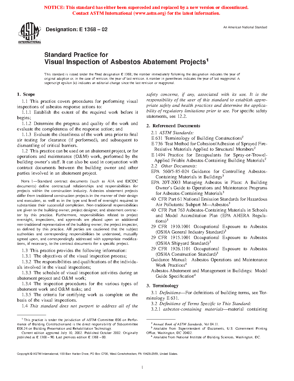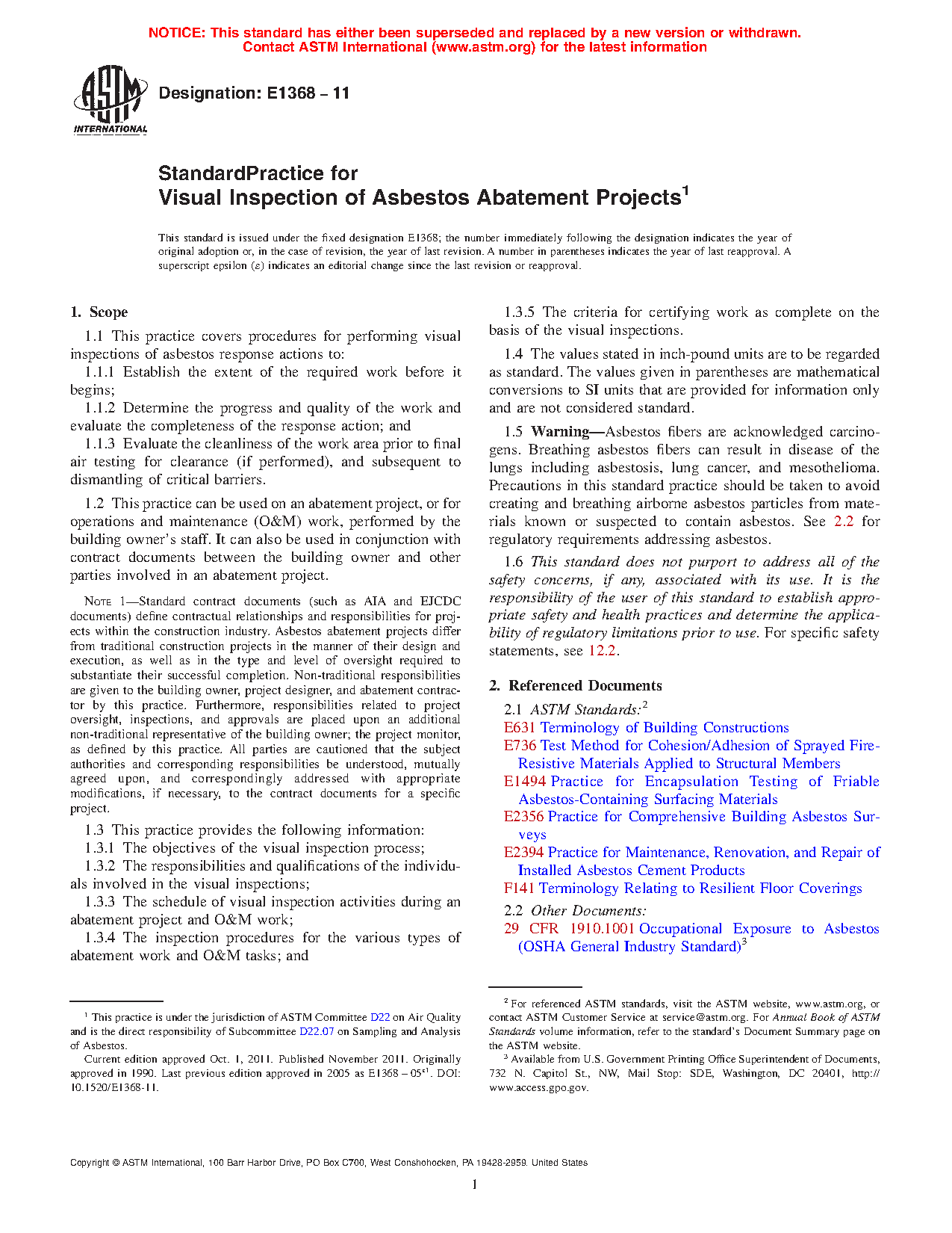 5.2 The specific objectives of the visual inspection process before, during, and at the conclusion of an asbestos abatement project are: to review the extent of asbestos-containing material (ACM) within the scope of work, to monitor performance of the work, and to verify if visible residue, dust or debris, or unremoved material are absent at the completion of removal and clean-up activities.