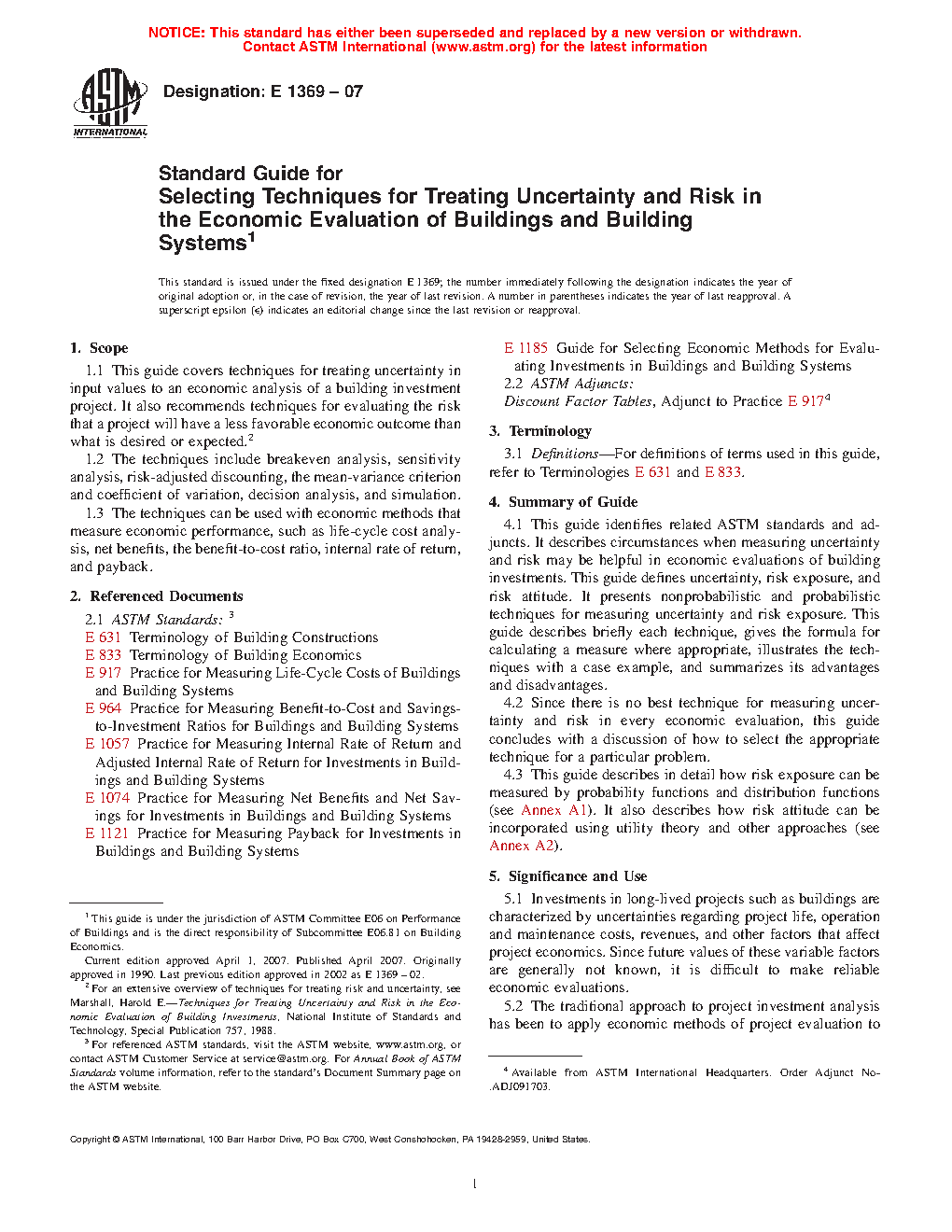 1.1 This guide covers techniques for treating uncertainty in input values to an economic analysis of a building investment project. It also recommends techniques for evaluating the risk that a project will have a less favorable economic outcome than what is desired or expected.2