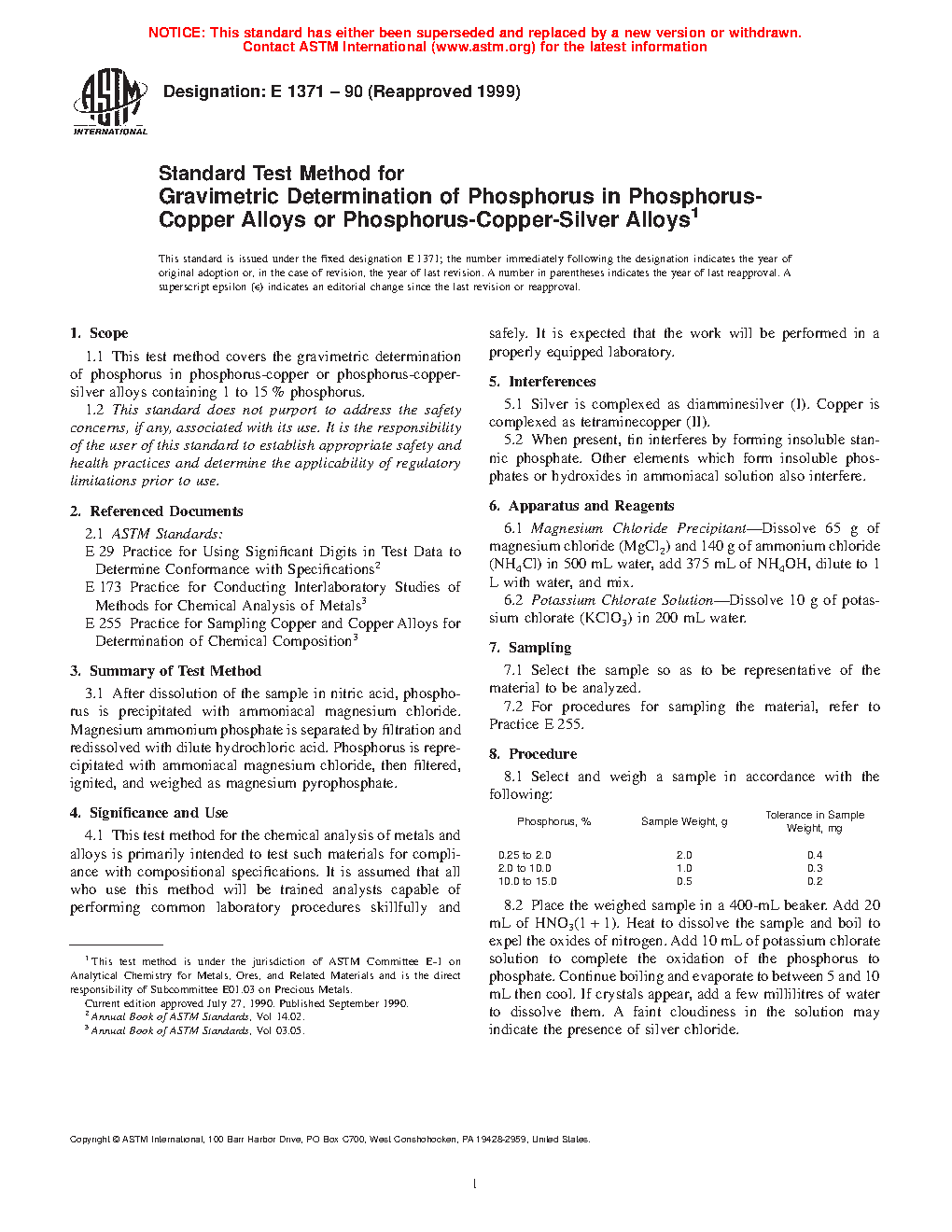 Standard Test Method for Gravimetric Determination of Phosphorus in Phosphorus-Copper Alloys or Phosphorus-Copper-Silver Alloys
