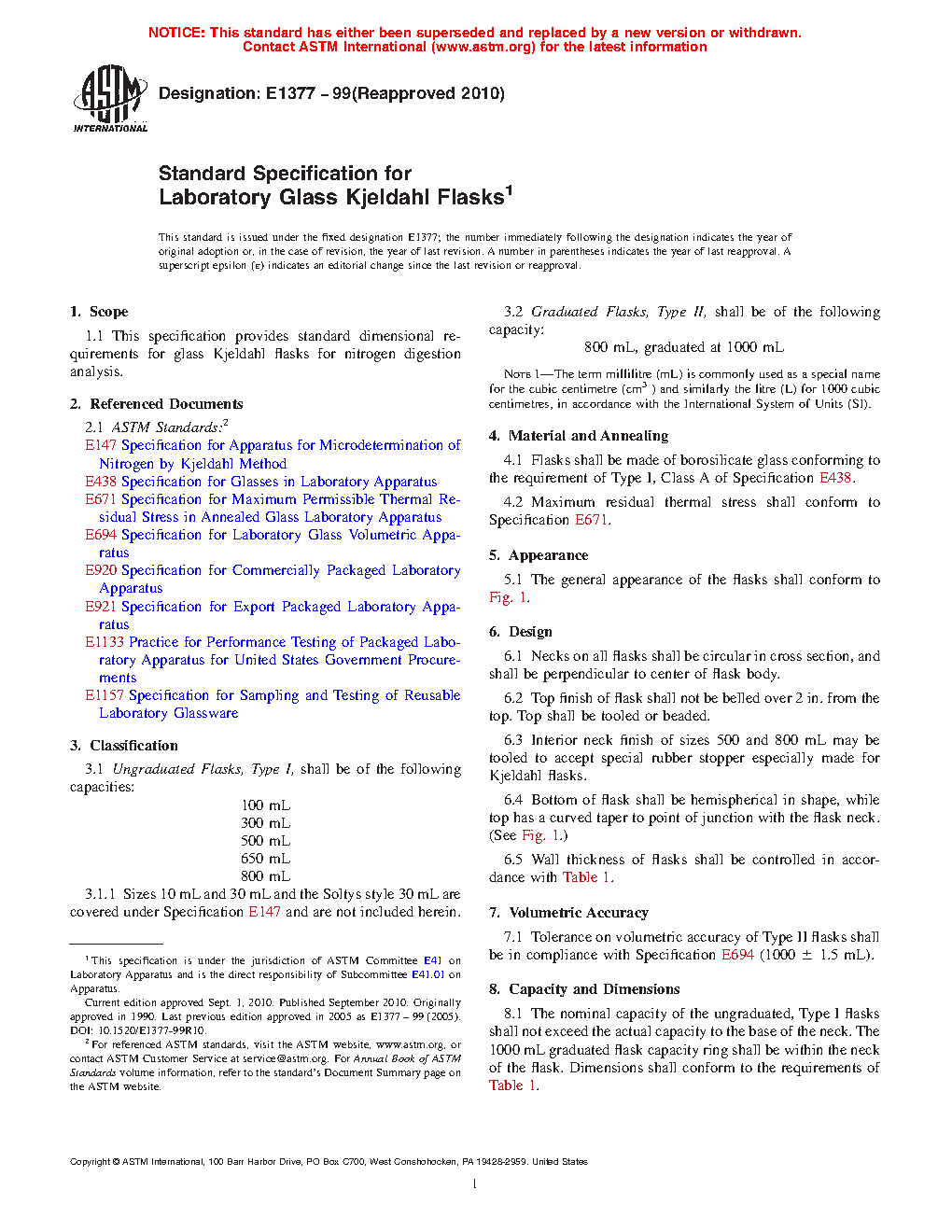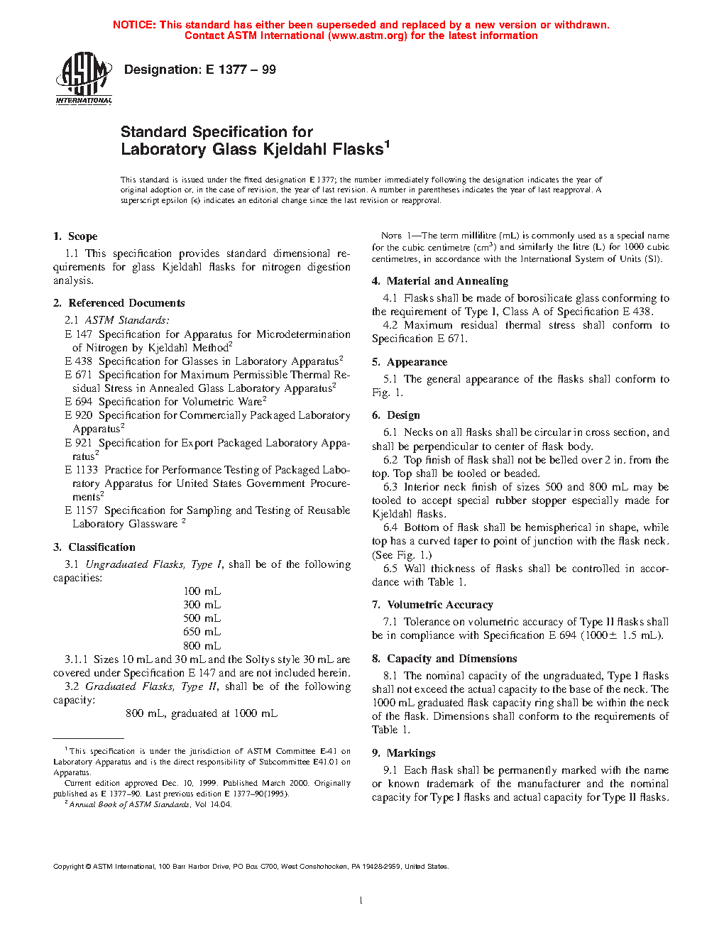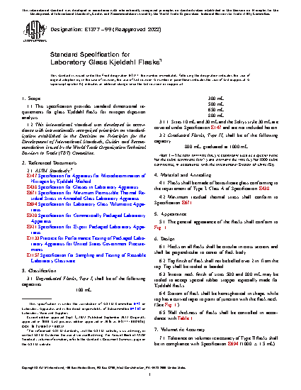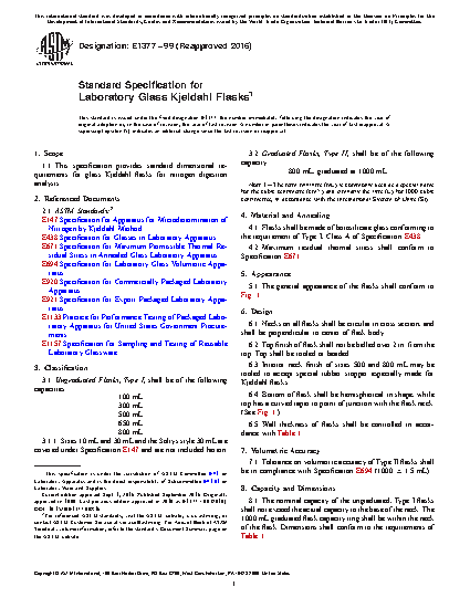 This specification provides standard dimensional requirements for glass Kjeldahl flasks for nitrogen digestion analysis. The ungraduated flasks, Type I, and graduated flasks, Type II, shall conform to the specified capacities. Flasks shall be made of borosilicate glass, conforming to the required maximum residual stress, tolerance of volumetric accuracy, and dimensions.