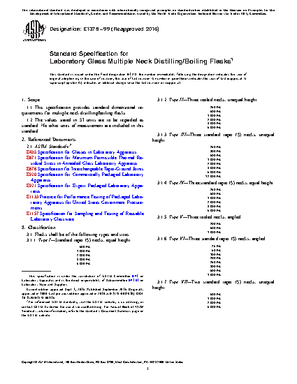 This specification provides the standard appearance, capacity, design, and dimensional requirements for eight types of multiple neck distilling/boiling glass flasks for laboratory use. Flasks, which shall be made of borosilicate glass conforming to specified maximum residual thermal stresses, are available in the following types: Type I, standard taper necks of equal height; Type II, three tooled necks of unequal height; Type III, three standard taper necks of unequal height; Type IV, three standard taper necks of equal height; Type V, three tooled necks that are angled; Type VI, three standard taper necks that are angled; Type VII, two standard taper necks of unequal height; and Type VIII, two standard taper necks that are angled.