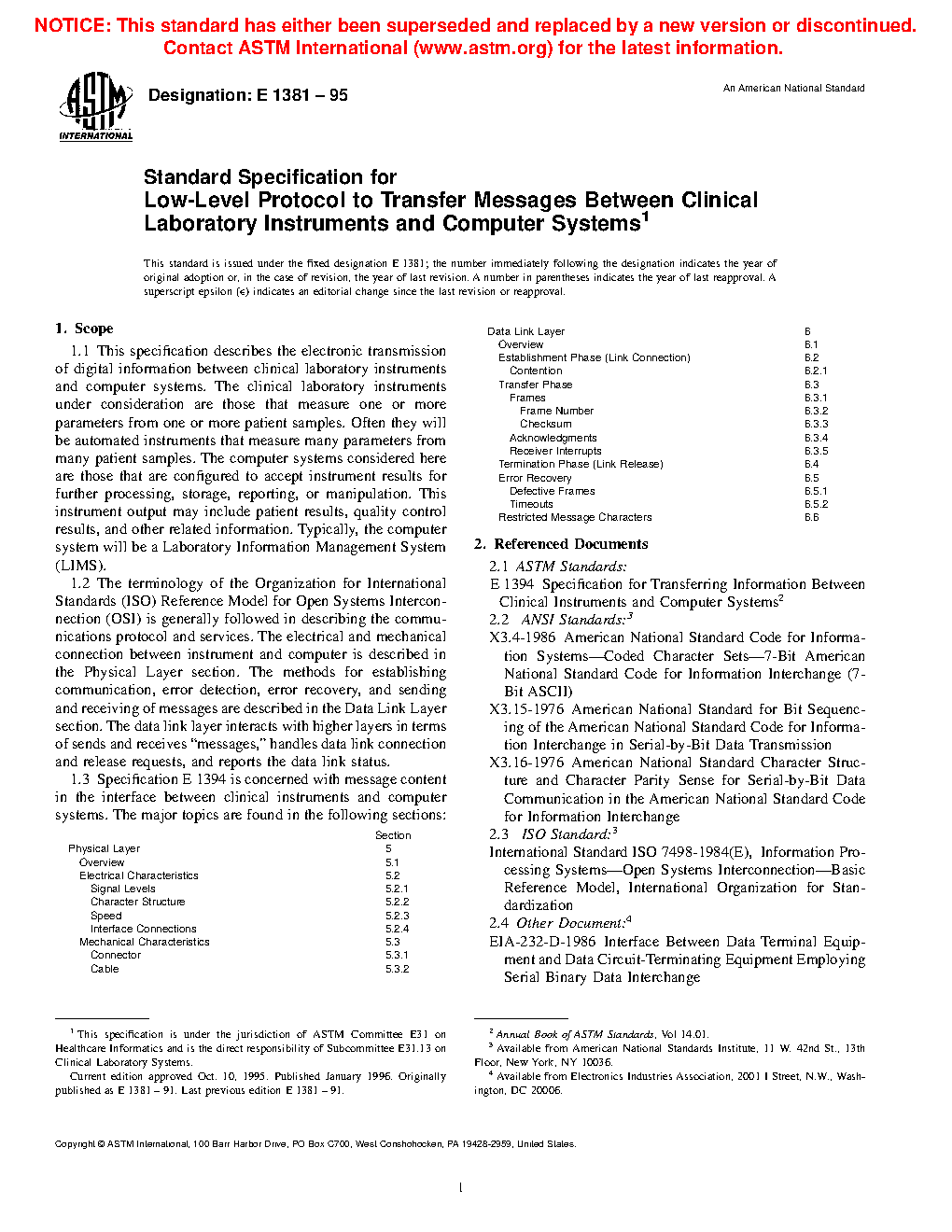 1.3 Specification E 1394 is concerned with message content in the interface between clinical instruments and computer systems. The major topics are found in the following sections: