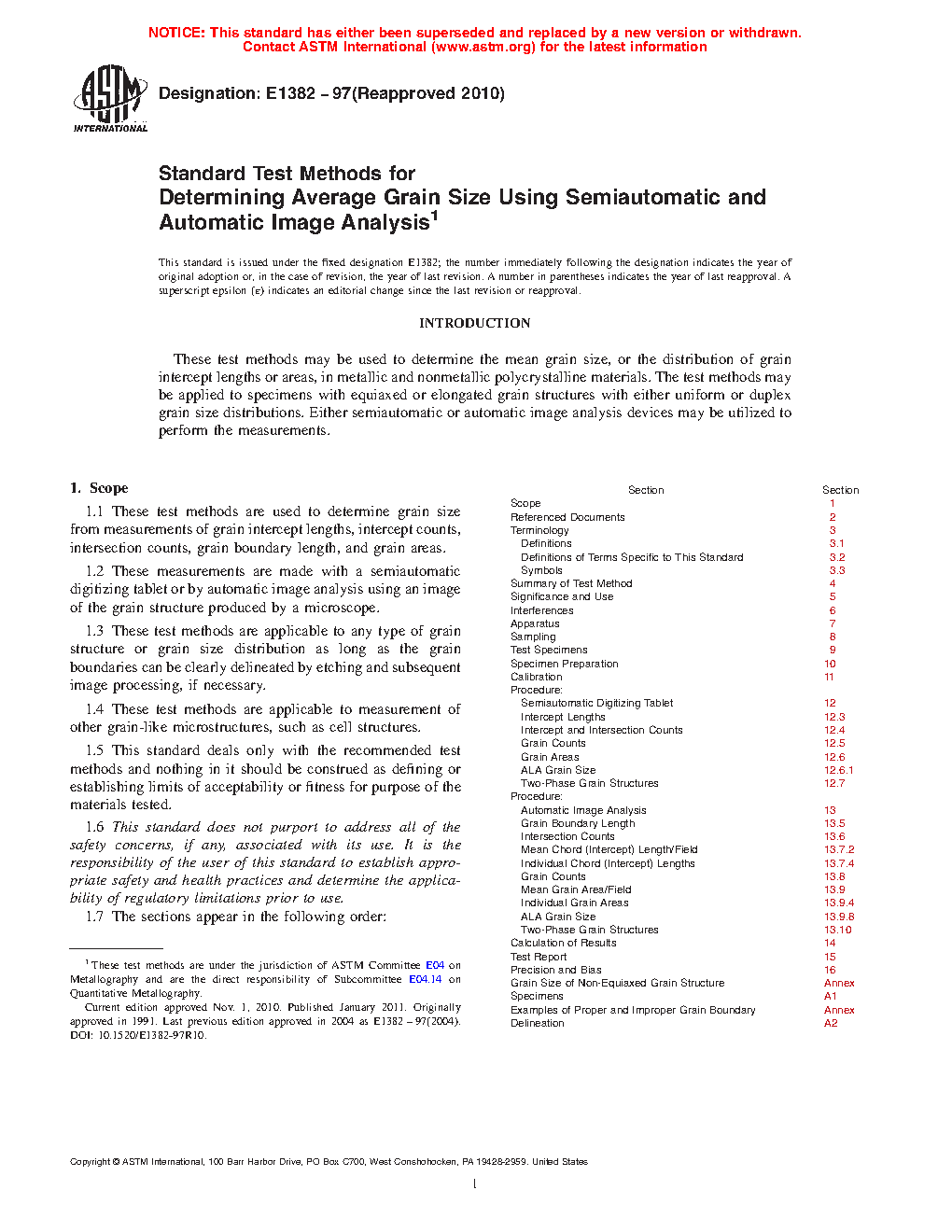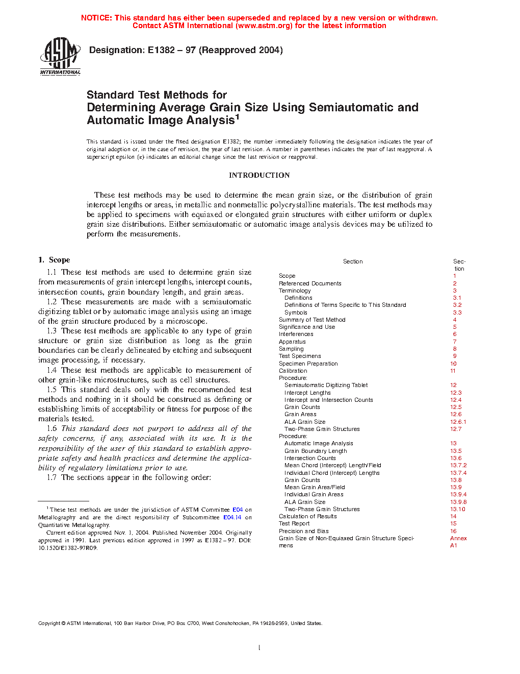 1.1 These test methods are used to determine grain size from measurements of grain intercept lengths, intercept counts, intersection counts, grain boundary length, and grain areas.