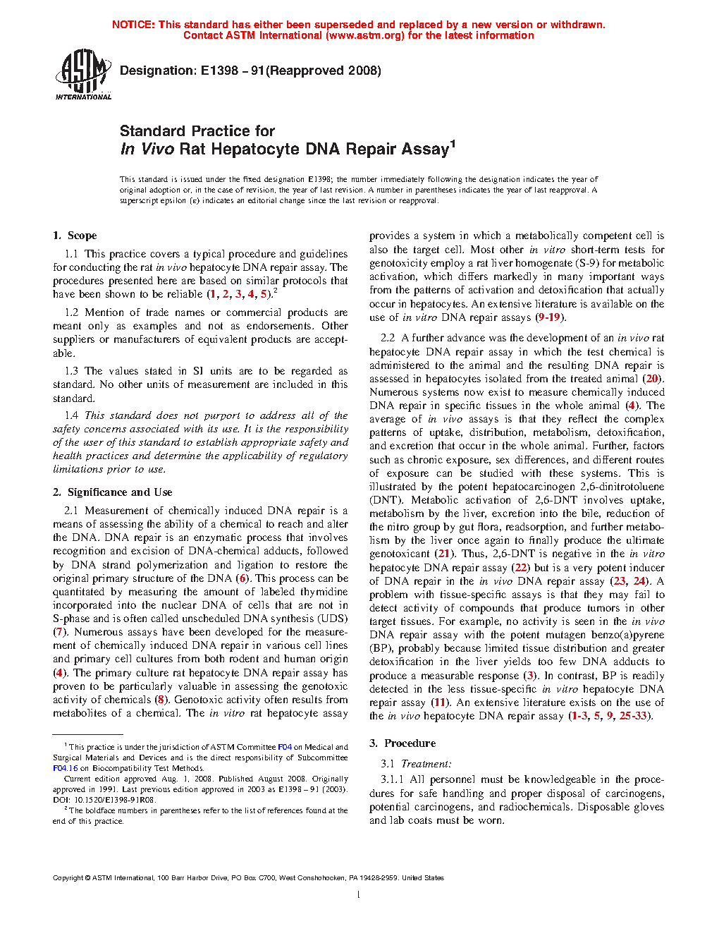 1.1 This practice covers a typical procedure and guidelines for conducting the rat in vivo hepatocyte DNA repair assay. The procedures presented here are based on similar protocols that have been shown to be reliable (1, 2, 3, 4, 5).