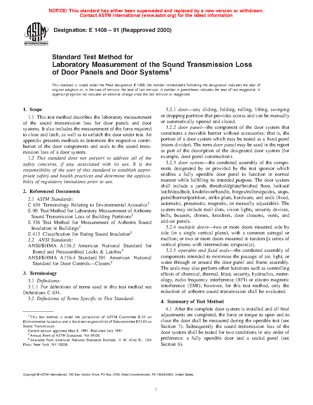 This test method evaluates the overall sound transmission loss of an operable door system which may include various seals and hardware components. An additional (nonmandatory) test procedure for assessing individual door components is given in Appendix X1.