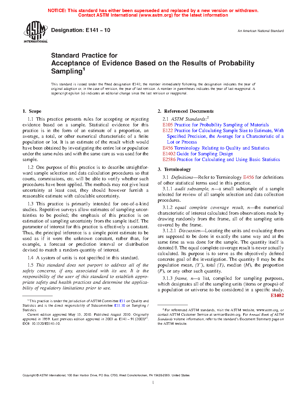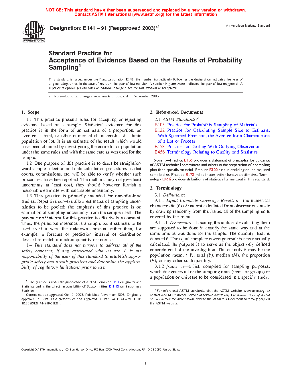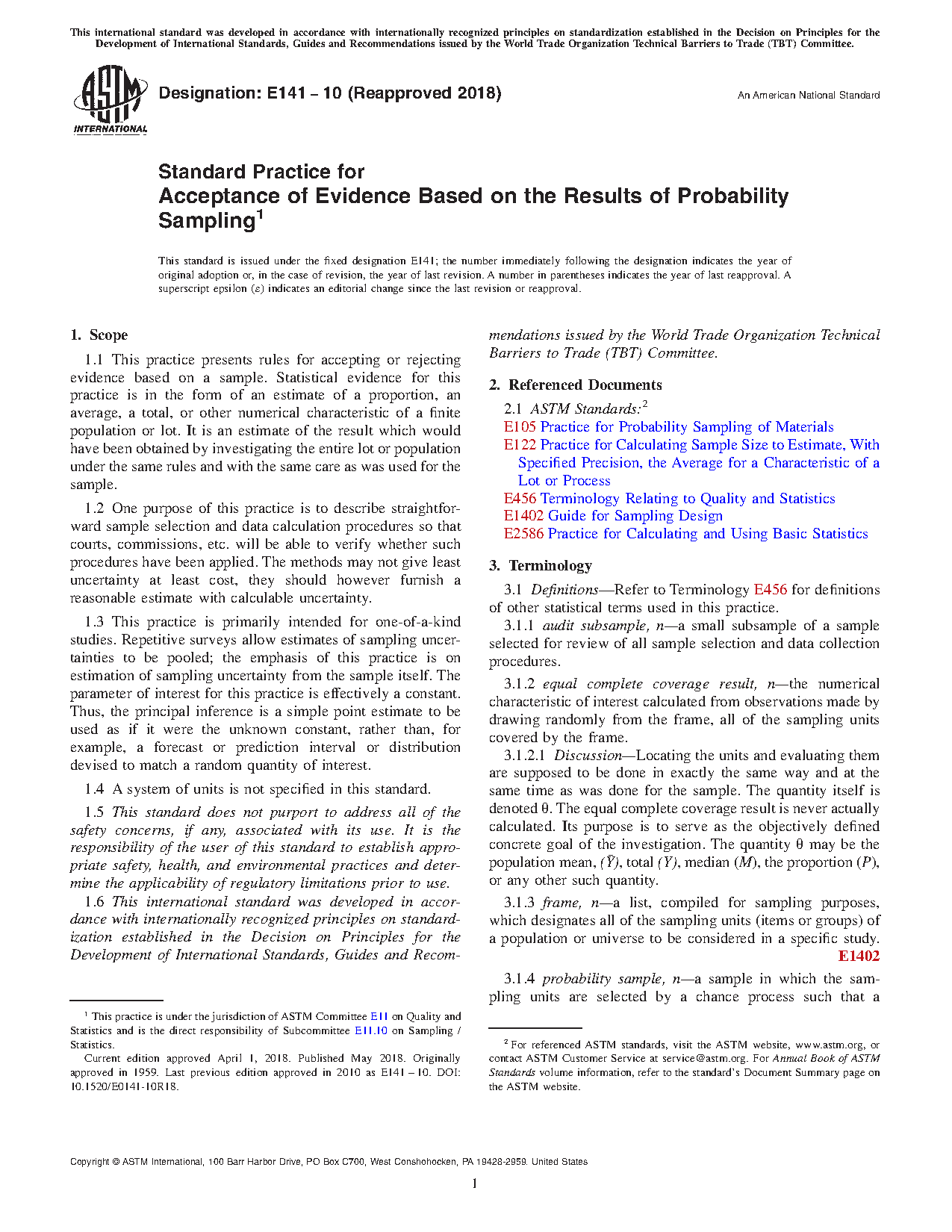 This practice presents rules for accepting or rejecting evidence based on a sample. Statistical evidence for this practice is in the form of an estimate of a proportion, an average, a total, or other numerical characteristic of a finite population or lot. This practice is an estimate of the result which would have been obtained by investigating the entire lot or population under the same rules and with the same care as was used for the sample. One purpose of this practice is to describe straightforward sample selection and data calculation procedures so that courts, commissions, etc. will be able to verify whether such procedures have been applied.