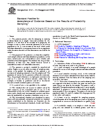 This practice presents rules for accepting or rejecting evidence based on a sample. Statistical evidence for this practice is in the form of an estimate of a proportion, an average, a total, or other numerical characteristic of a finite population or lot. This practice is an estimate of the result which would have been obtained by investigating the entire lot or population under the same rules and with the same care as was used for the sample. One purpose of this practice is to describe straightforward sample selection and data calculation procedures so that courts, commissions, etc. will be able to verify whether such procedures have been applied.